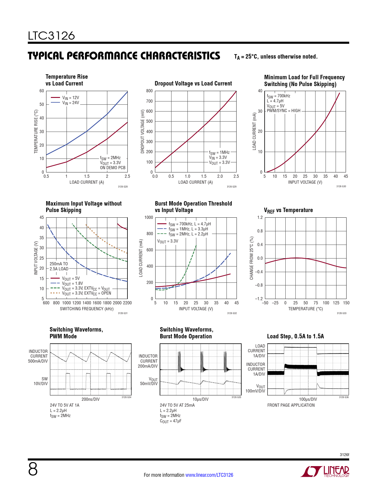 Typical perForMance characTerisTics TA = 25°C, unless otherwise noted. Temperature Rise Minimum Load for Full Frequency vs Load Current Dropout Voltage vs Load Current Switching (No Pulse Skipping)