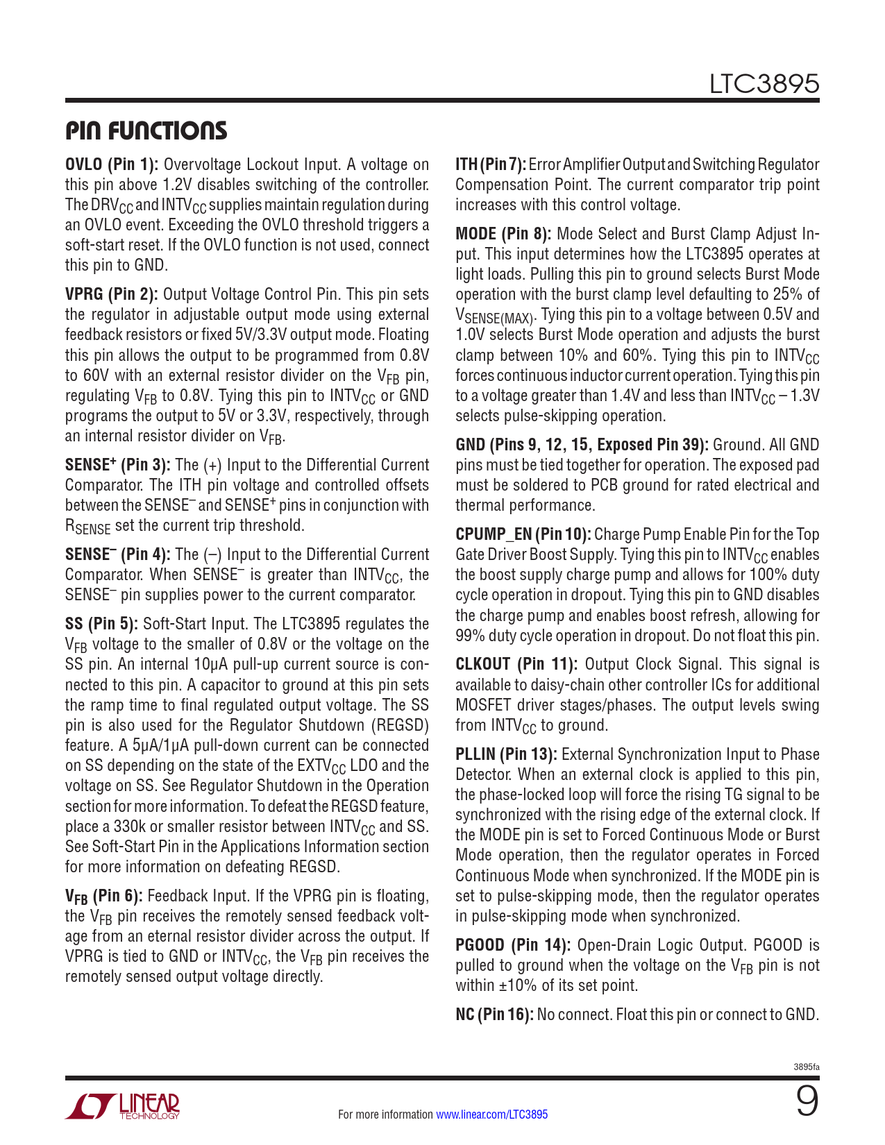 No connect. Float this pin or connect to GND. 3895fa For more information www.linear.com/LTC3895 9 Document Outline Features Applications Typical Application Description Absolute Maximum Ratings Order Information Pin Configuration Electrical Characteristics Typical Performance Characteristics Pin Functions Functional Diagram Operation Applications Information Typical Applications Package Description Revision History Typical Application Related Parts