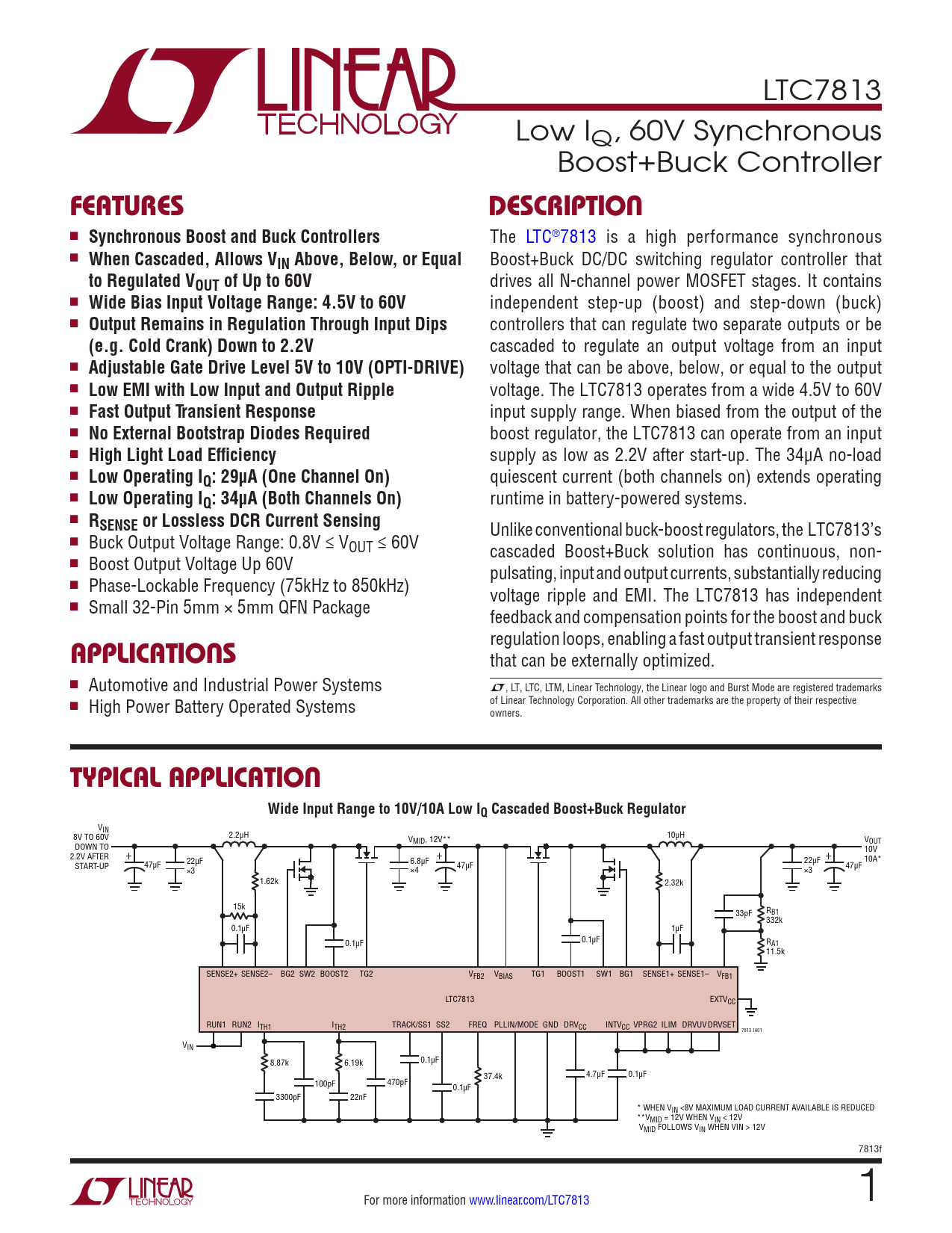 LTC7813 Low IQ, 60V Synchronous Boost+Buck Controller FeaTuresDescripTion n Synchronous Boost and Buck Controllers The LTC®7813 is a high performance synchronous n When Cascaded, Allows VIN Above, Below, or Equal Boost+Buck DC/DC switching regulator controller that to Regulated VOUT of Up to 60V drives all N-channel power MOSFET stages. It contains n Wide Bias Input Voltage Range: 4.5V to 60V independent step-up (boost) and step-down (buck) n Output Remains in Regulation Through Input Dips controllers that can regulate two separate outputs or be (e.g. Cold Crank) Down to 2.2V cascaded to regulate an output voltage from an input n Adjustable Gate Drive Level 5V to 10V (OPTI-DRIVE) voltage that can be above, below, or equal to the output n Low EMI with Low Input and Output Ripple voltage. The LTC7813 operates from a wide 4.5V to 60V n Fast Output Transient Response input supply range. When biased from the output of the n No External Bootstrap Diodes Required boost regulator, the LTC7813 can operate from an input n High Light Load Efficiency supply as low as 2.2V after start-up. The 34μA no-load n Low Operating IQ: 29µA (One Channel On) quiescent current (both channels on) extends operating n Low Operating IQ: 34µA (Both Channels On) runtime in battery-powered systems. n RSENSE or Lossless DCR Current Sensing Unlike conventional buck-boost regulators, the LTC7813’s n Buck Output Voltage Range: 0.8V ≤ VOUT ≤ 60V cascaded Boost+Buck solution has continuous, non- n Boost Output Voltage Up 60V pulsating, input and output currents, substantially reducing n Phase-Lockable Frequency (75kHz to 850kHz) voltage ripple and EMI. The LTC7813 has independent n Small 32-Pin 5mm × 5mm QFN Package feedback and compensation points for the boost and buck regulation loops, enabling a fast output transient response applicaTions that can be externally optimized. n Automotive and Industrial Power Systems L, LT, LTC, LTM, Linear Technology, the Linear logo and Burst Mode are registered trademarks of Linear Technology Corporation. All other trademarks are the property of their respective n High Power Battery Operated Systems owners. Typical applicaTionWide Input Range to 10V/10A Low IQ Cascaded Boost+Buck Regulator VIN 8V TO 60V 2.2µH 10µH VMID, 12V** VOUT DOWN TO 10V 2.2V AFTER 22µF 6.8µF 10A* START-UP 47µF 22µF ×3 ×4 47µF 47µF ×3 1.62k 2.32k 15k R 33pF B1 332k 0.1µF 1µF 0.1µF 0.1µF RA1 11.5k SENSE2+ SENSE2– BG2 SW2 BOOST2 TG2 VFB2 VBIAS TG1 BOOST1 SW1 BG1 SENSE1+ SENSE1– VFB1 LTC7813 EXTVCC RUN1 RUN2 ITH1 ITH2 TRACK/SS1 SS2 FREQ PLLIN/MODE GND DRVCC INTVCC VPRG2 ILIM DRVUVDRVSET 7813 TA01 VIN 8.87k 6.19k 0.1µF 4.7µF 0.1µF 37.4k 100pF 470pF 0.1µF 3300pF 22nF * WHEN VIN <8V MAXIMUM LOAD CURRENT AVAILABLE IS REDUCED **VMID = 12V WHEN VIN < 12V VMID FOLLOWS VIN WHEN VIN > 12V 7813f For more information www.linear.com/LTC7813 1 Document Outline Features Applications Typical Application Description Absolute Maximum Ratings Order Information Pin Configuration Electrical Characteristics Typical Performance Characteristics Pin Functions Functional Diagrams Operation Applications Information Typical Applications Package Description Typical Application Related Parts