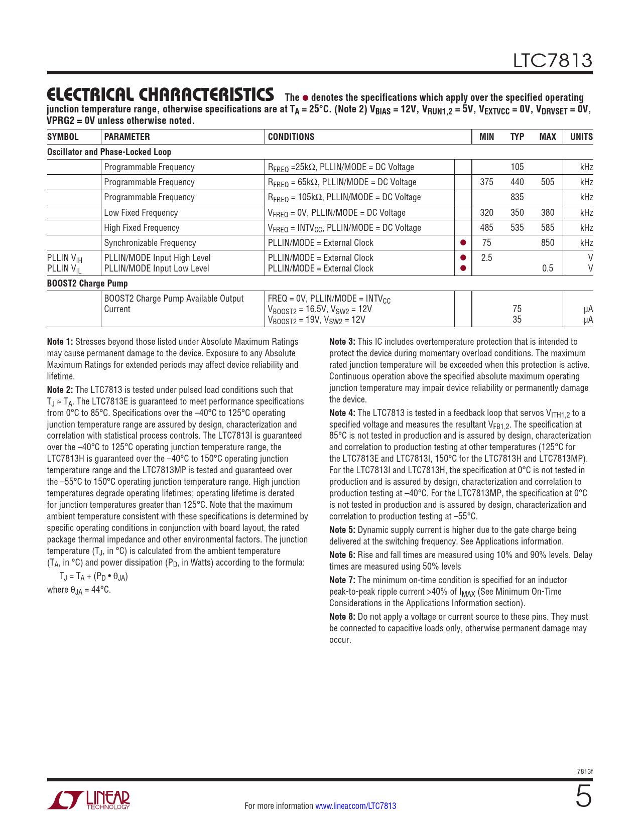 The LTC7813 is tested under pulsed load conditions such that junction temperature may impair device reliability or permanently damage T the device. J ≈ TA. The LTC7813E is guaranteed to meet performance specifications from 0°C to 85°C. Specifications over the –40°C to 125°C operating