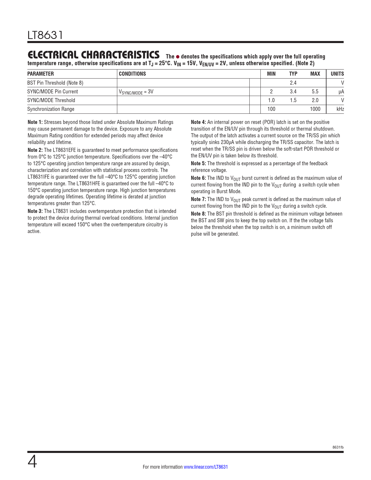 LT8631 ELECTRICALCHARACTERISTICS The l denotes the specifications which apply over the full operatingtemperature range, otherwise specifications are at TJ = 25°C. VIN = 15V, VEN/UV = 2V, unless otherwise specified. (Note 2)PARAMETERCONDITIONSMINTYPMAXUNITS BST Pin Threshold (Note 8) 2.4 V SYNC/MODE Pin Current VSYNC/MODE = 3V 2 3.4 5.5 µA SYNC/MODE Threshold 1.0 1.5 2.0 V Synchronization Range 100 1000 kHz Note 1: Stresses beyond those listed under Absolute Maximum Ratings Note 4: An internal power on reset (POR) latch is set on the positive may cause permanent damage to the device. Exposure to any Absolute transition of the EN/UV pin through its threshold or thermal shutdown. Maximum Rating condition for extended periods may affect device The output of the latch activates a current source on the TR/SS pin which reliability and lifetime. typically sinks 230µA while discharging the TR/SS capacitor. The latch is Note 2: The LT8631EFE is guaranteed to meet performance specifications reset when the TR/SS pin is driven below the soft-start POR threshold or from 0°C to 125°C junction temperature. Specifications over the –40°C the EN/UV pin is taken below its threshold. to 125°C operating junction temperature range are assured by design, Note 5: The threshold is expressed as a percentage of the feedback characterization and correlation with statistical process controls. The reference voltage. LT8631IFE is guaranteed over the full –40°C to 125°C operating junction Note 6: The IND to VOUT burst current is defined as the maximum value of temperature range. The LT8631HFE is guaranteed over the full –40°C to current flowing from the IND pin to the VOUT during a switch cycle when 150°C operating junction temperature range. High junction temperatures operating in Burst Mode. degrade operating lifetimes. Operating lifetime is derated at junction Note 7: The IND to V temperatures greater than 125°C. OUT peak current is defined as the maximum value of current flowing from the IND pin to the VOUT during a switch cycle. Note 3: The LT8631 includes overtemperature protection that is intended Note 8: The BST pin threshold is defined as the minimum voltage between to protect the device during thermal overload conditions. Internal junction the BST and SW pins to keep the top switch on. If the the voltage falls temperature will exceed 150°C when the overtemperature circuitry is below the threshold when the top switch is on, a minimum switch off active. pulse will be generated. 8631fb 4 For more information www.linear.com/LT8631