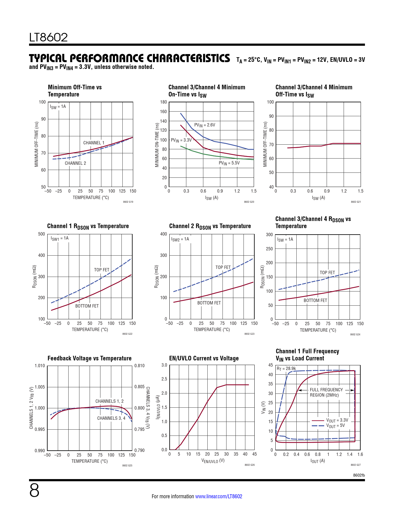 100 180 100 ISW = 1A 160 90 90 140 PVIN = 2.6V 120 80 80 100 PV CHANNEL 1 IN = 3.3V 70 80 70 60 60 MINIMUM OFF-TIME (ns) CHANNEL 2 MINIMUM ON-TIME (ns) PVIN = 5.5V MINIMUM OFF-TIME (ns) 60 40 50 20 50 0 40 –50 –25 0 25 50 75 100 125 150 0 0.3 0.6 0.9 1.2 1.5 0 0.3 0.6 0.9 1.2 1.5 TEMPERATURE (°C) ISW (A) ISW (A) 8602 G19 8602 G20 8602 G21