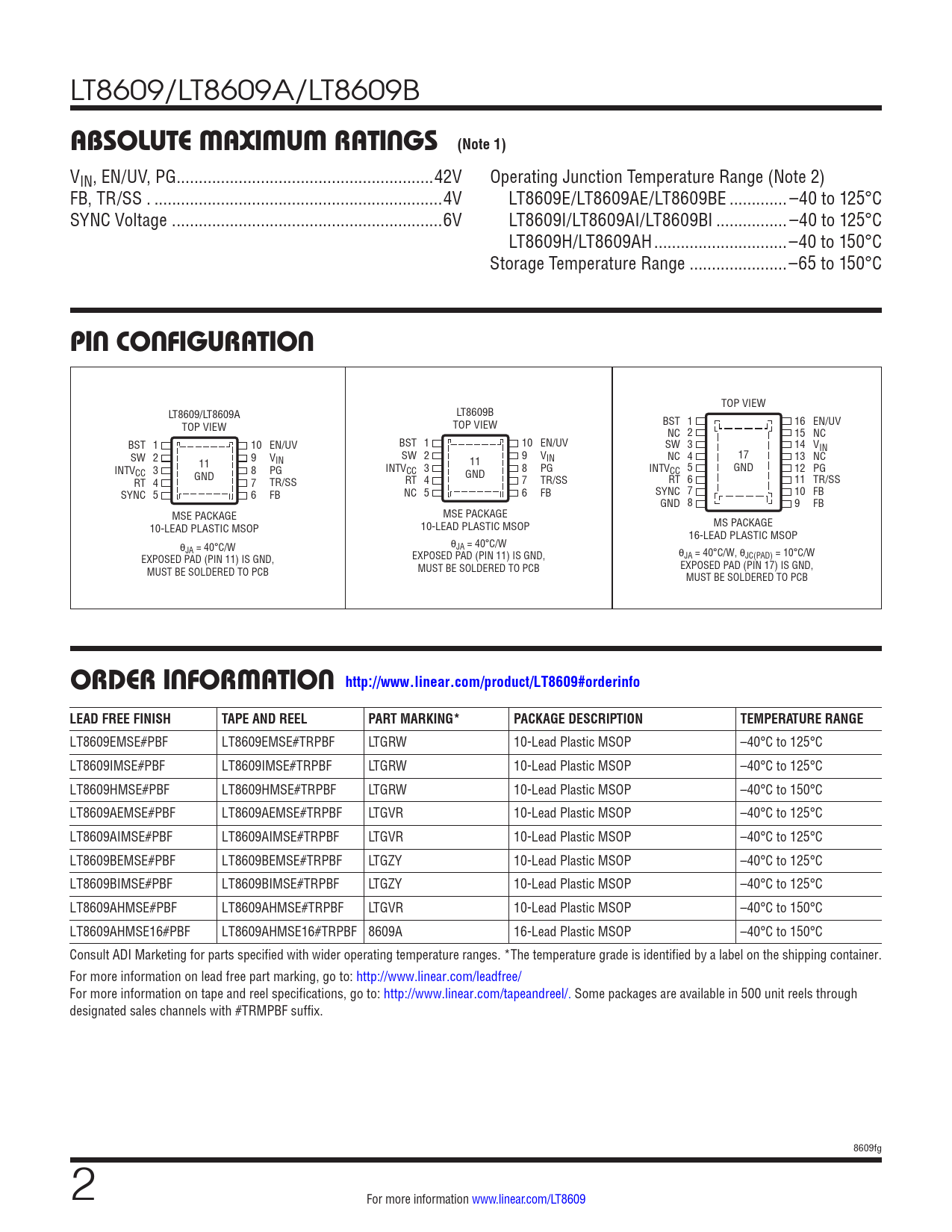 LT8609/LT8609A/LT8609B ABSOLUTE MAXIMUM RATINGS (Note 1) VIN, EN/UV, PG ..42V Operating Junction Temperature Range (Note 2) FB, TR/SS . ...4V LT8609E/LT8609AE/LT8609BE ... –40 to 125°C SYNC Voltage . ..6V LT8609I/LT8609AI/LT8609BI .. –40 to 125°C LT8609H/LT8609AH ..–40 to 150°C Storage Temperature Range ..–65 to 150°C PIN CONFIGURATION TOP VIEW LT8609/LT8609A LT8609B TOP VIEW TOP VIEW BST 1 16 EN/UV NC 2 15 NC BST 1 10 EN/UV BST 1 10 EN/UV SW 3 14 VIN SW 2 9 V 17 IN SW 2 9 VIN 11 NC 4 13 NC INTV 11 GND CC 3 8 PG INTVCC 3 8 PG GND INTV 5 CC 12 PG RT 4 GND 7 TR/SS RT 4 7 TR/SS RT 6 11 TR/SS SYNC 5 6 FB NC 5 6 FB SYNC 7 10 FB GND 8 9 FB MSE PACKAGE MSE PACKAGE 10-LEAD PLASTIC MSOP 10-LEAD PLASTIC MSOP MS PACKAGE 16-LEAD PLASTIC MSOP θ θ JA = 40°C/W JA = 40°C/W EXPOSED PAD (PIN 11) IS GND, EXPOSED PAD (PIN 11) IS GND, θJA = 40°C/W, θJC(PAD) = 10°C/W EXPOSED PAD (PIN 17) IS GND, MUST BE SOLDERED TO PCB MUST BE SOLDERED TO PCB MUST BE SOLDERED TO PCB ORDER INFORMATION http://www.linear.com/product/LT8609#orderinfoLEAD FREE FINISHTAPE AND REELPART MARKING*PACKAGE DESCRIPTIONTEMPERATURE RANGE LT8609EMSE#PBF LT8609EMSE#TRPBF LTGRW 10-Lead Plastic MSOP –40°C to 125°C LT8609IMSE#PBF LT8609IMSE#TRPBF LTGRW 10-Lead Plastic MSOP –40°C to 125°C LT8609HMSE#PBF LT8609HMSE#TRPBF LTGRW 10-Lead Plastic MSOP –40°C to 150°C LT8609AEMSE#PBF LT8609AEMSE#TRPBF LTGVR 10-Lead Plastic MSOP –40°C to 125°C LT8609AIMSE#PBF LT8609AIMSE#TRPBF LTGVR 10-Lead Plastic MSOP –40°C to 125°C LT8609BEMSE#PBF LT8609BEMSE#TRPBF LTGZY 10-Lead Plastic MSOP –40°C to 125°C LT8609BIMSE#PBF LT8609BIMSE#TRPBF LTGZY 10-Lead Plastic MSOP –40°C to 125°C LT8609AHMSE#PBF LT8609AHMSE#TRPBF LTGVR 10-Lead Plastic MSOP –40°C to 150°C LT8609AHMSE16#PBF LT8609AHMSE16#TRPBF 8609A 16-Lead Plastic MSOP –40°C to 150°C Consult ADI Marketing for parts specified with wider operating temperature ranges. *The temperature grade is identified by a label on the shipping container. For more information on lead free part marking, go to: http://www.linear.com/leadfree/ For more information on tape and reel specifications, go to: http://www.linear.com/tapeandreel/. Some packages are available in 500 unit reels through designated sales channels with #TRMPBF suffix. 8609fg 2 For more information www.linear.com/LT8609 Document Outline Features Applications Typical Application Description Absolute Maximum Ratings Pin Configuration Order Information Electrical Characteristics Typical Performance Characteristics Pin Functions Block Diagram Operation Applications Information Typical Applications Package Description Revision History Typical Application Related Parts
