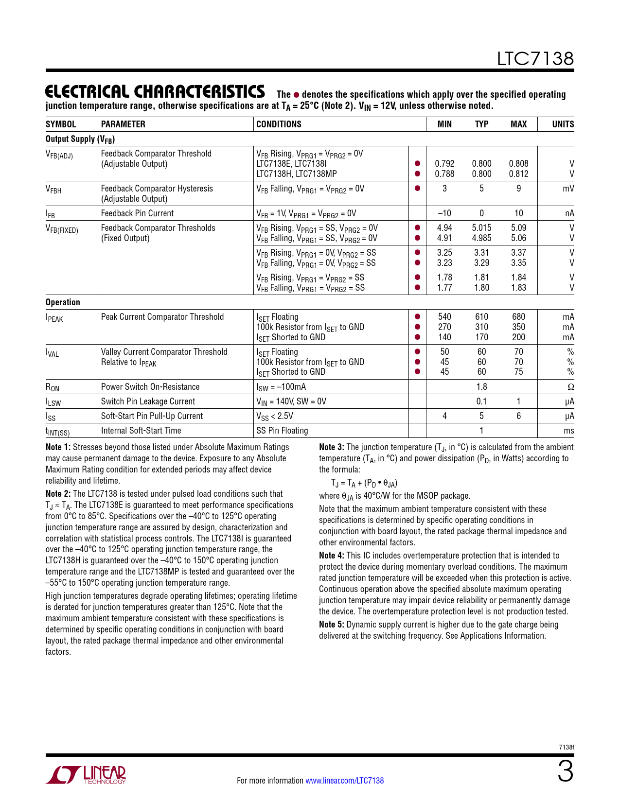 VFB(ADJ) Feedback Comparator Threshold VFB Rising, VPRG1 = VPRG2 = 0V (Adjustable Output) LTC7138E, LTC7138I l 0.792 0.800 0.808 V LTC7138H, LTC7138MP l 0.788 0.800 0.812 V VFBH Feedback Comparator Hysteresis VFB Falling, VPRG1 = VPRG2 = 0V l 3 5 9 mV (Adjustable Output) IFB Feedback Pin Current VFB = 1V, VPRG1 = VPRG2 = 0V –10 0 10 nA VFB(FIXED) Feedback Comparator Thresholds VFB Rising, VPRG1 = SS, VPRG2 = 0V l 4.94 5.015 5.09 V (Fixed Output) VFB Falling, VPRG1 = SS, VPRG2 = 0V l 4.91 4.985 5.06 V VFB Rising, VPRG1 = 0V, VPRG2 = SS l 3.25 3.31 3.37 V VFB Falling, VPRG1 = 0V, VPRG2 = SS l 3.23 3.29 3.35 V VFB Rising, VPRG1 = VPRG2 = SS l 1.78 1.81 1.84 V VFB Falling, VPRG1 = VPRG2 = SS l 1.77 1.80 1.83 V