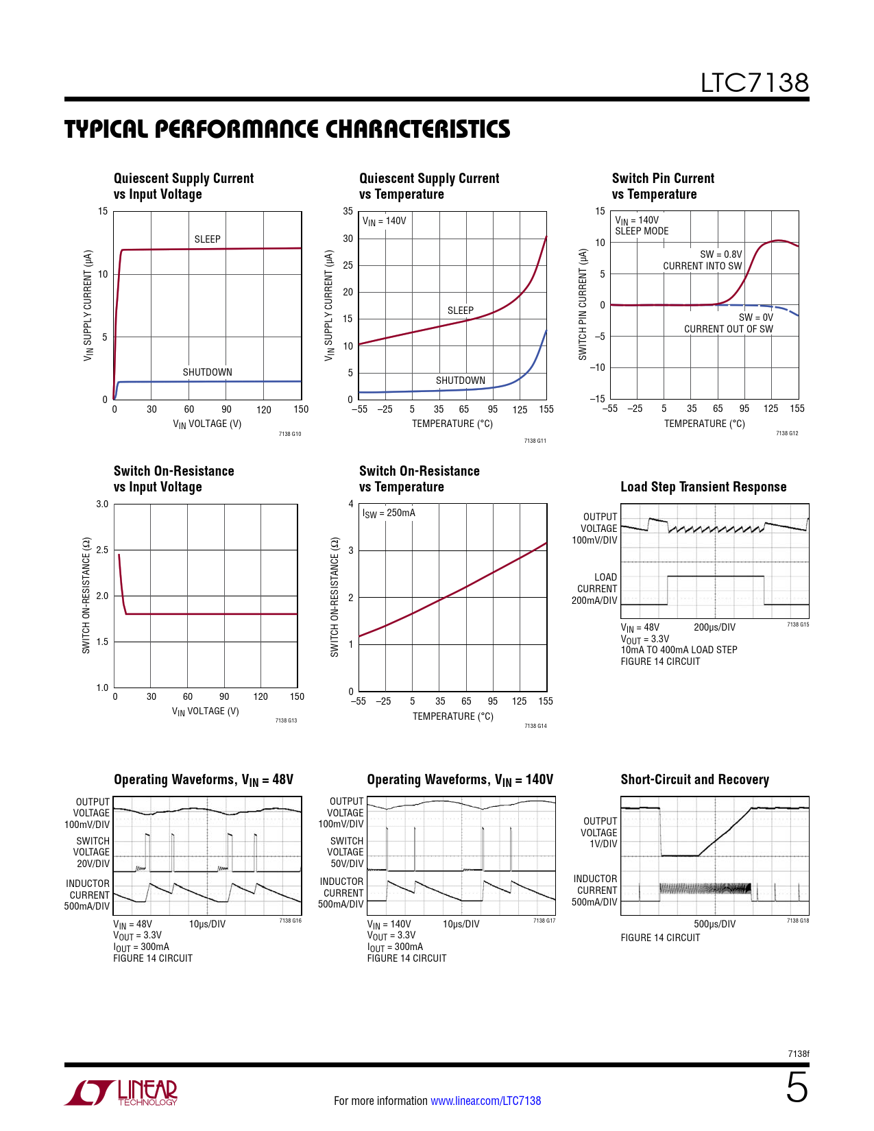 15 35 15 VIN = 140V VIN = 140V SLEEP MODE SLEEP 30 10 SW = 0.8V 25 CURRENT INTO SW 10 5 20 SLEEP 0 15 SW = 0V CURRENT OUT OF SW 5 –5 SUPPLY CURRENT (µA) SUPPLY CURRENT (µA) 10 V IN V IN SWITCH PIN CURRENT (µA) SHUTDOWN 5 –10 SHUTDOWN 0 0 –15 0 30 60 90 120 150 –55 –25 5 35 65 95 125 155 –55 –25 5 35 65 95 125 155 VIN VOLTAGE (V) TEMPERATURE (°C) TEMPERATURE (°C) 7138 G10 7138 G12 7138 G11