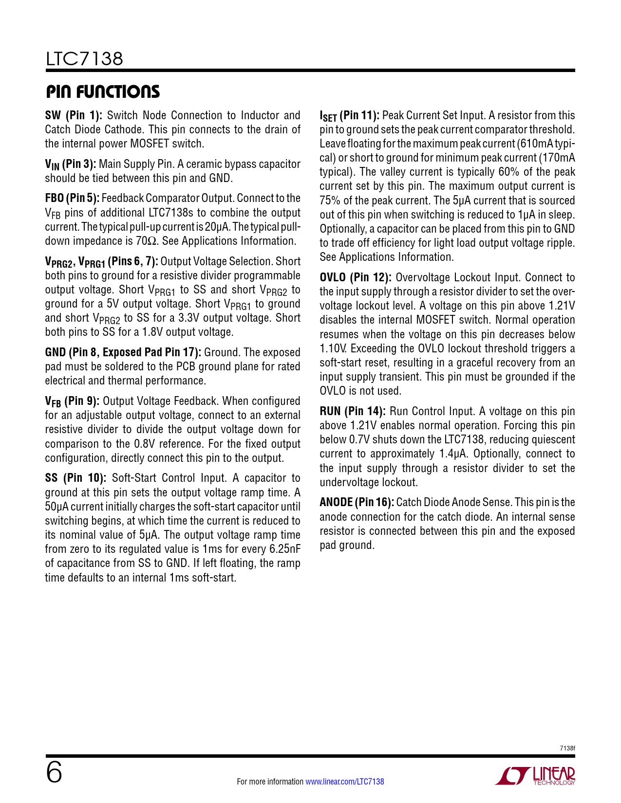 pin FuncTions. SW (Pin 1):. ISET (Pin 11):. IN (Pin 3):. FBO (Pin 5):. PRG2, VPRG1 (Pins 6, 7):. OVLO (Pin 12):