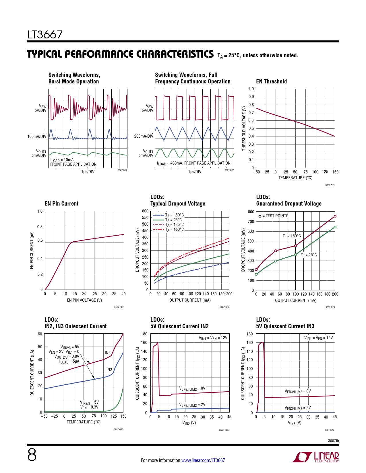 1.0 600 800 T 550 A = –50°C = TEST POINTS TA = 25°C 500 700 0.8 TA = 125°C 450 TA = 150°C 600 400 TJ = 150°C 0.6 500 350 300 400 TJ = 25°C 0.4 250 300 200 EN PIN CURRENT (µA) DROPOUT VOLTAGE (mV) 150 DROPOUT VOLTAGE (mV) 200 0.2 100 100 50 0 0 0 0 5 10 15 20 25 30 35 40 0 20 40 60 80 100 120 140 160 180 200 0 20 40 60 80 100 120 140 160 180 200 EN PIN VOLTAGE (V) OUTPUT CURRENT (mA) OUTPUT CURRENT (mA) 3667 G22 3667 G23 3667 G24