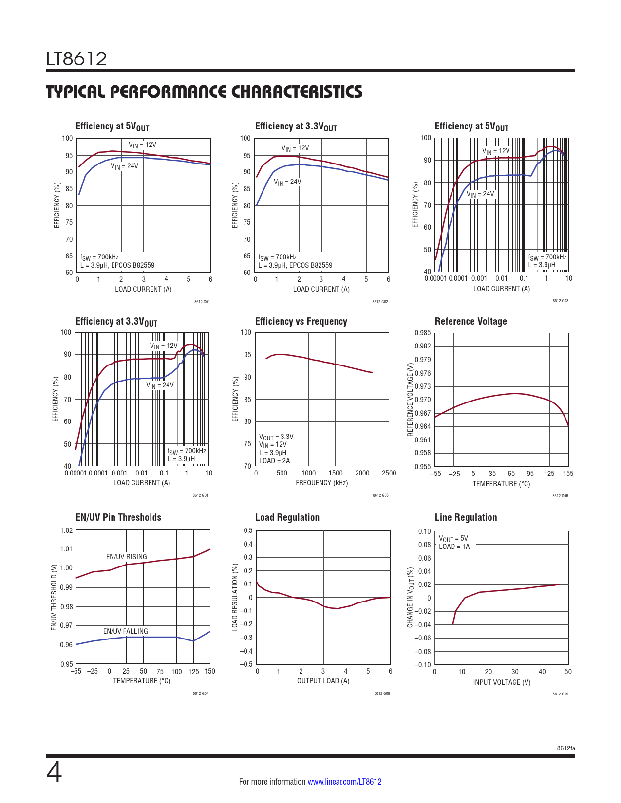 100 100 0.985 VIN = 12V 0.982 90 95 0.979 0.976 80 90 VIN = 24V 0.973 70 85 0.970 0.967 EFFICIENCY (%) EFFICIENCY (%) 60 80 0.964 REFERENCE VOLTAGE (V) VOUT = 3.3V 0.961 50 75 VIN = 12V fSW = 700kHz L = 3.9µH 0.958 L = 3.9µH LOAD = 2A 40 70 0.955 0.00001 0.0001 0.001 0.01 0.1 1 10 0 500 1000 1500 2000 2500 –55 –25 5 35 65 95 125 155 LOAD CURRENT (A) FREQUENCY (kHz) TEMPERATURE (°C) 8612 G04 8612 G05 8612 G06