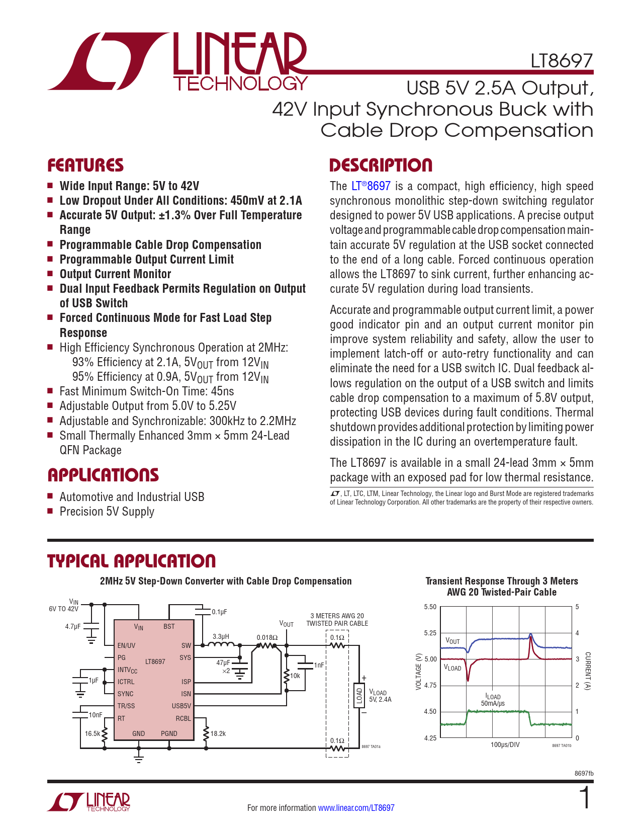 LT8697 USB 5V 2.5A Output, 42V Input Synchronous Buck with Cable Drop Compensation FEATURESDESCRIPTION n Wide Input Range: 5V to 42V The LT®8697 is a compact, high efficiency, high speed n Low Dropout Under All Conditions: 450mV at 2.1A synchronous monolithic step-down switching regulator n Accurate 5V Output: ±1.3% Over Full Temperature designed to power 5V USB applications. A precise output Range voltage and programmable cable drop compensation main- n Programmable Cable Drop Compensation tain accurate 5V regulation at the USB socket connected n Programmable Output Current Limit to the end of a long cable. Forced continuous operation n Output Current Monitor allows the LT8697 to sink current, further enhancing ac- n Dual Input Feedback Permits Regulation on Output curate 5V regulation during load transients. of USB Switch Accurate and programmable output current limit, a power n Forced Continuous Mode for Fast Load Step good indicator pin and an output current monitor pin Response improve system reliability and safety, allow the user to n High Efficiency Synchronous Operation at 2MHz: implement latch-off or auto-retry functionality and can 93% Efficiency at 2.1A, 5VOUT from 12VIN eliminate the need for a USB switch IC. Dual feedback al- 95% Efficiency at 0.9A, 5VOUT from 12VIN lows regulation on the output of a USB switch and limits n Fast Minimum Switch-On Time: 45ns cable drop compensation to a maximum of 5.8V output, n Adjustable Output from 5.0V to 5.25V protecting USB devices during fault conditions. Thermal n Adjustable and Synchronizable: 300kHz to 2.2MHz shutdown provides additional protection by limiting power n Small Thermally Enhanced 3mm × 5mm 24-Lead dissipation in the IC during an overtemperature fault. QFN Package The LT8697 is available in a small 24-lead 3mm × 5mm APPLICATIONS package with an exposed pad for low thermal resistance. L n , LT, LTC, LTM, Linear Technology, the Linear logo and Burst Mode are registered trademarks Automotive and Industrial USB of Linear Technology Corporation. All other trademarks are the property of their respective owners. n Precision 5V Supply TYPICAL APPLICATION2MHz 5V Step-Down Converter with Cable Drop CompensationTransient Response Through 3 MetersAWG 20 Twisted-Pair Cable VIN 6V TO 42V 5.50 5 0.1µF 3 METERS AWG 20 4.7µF V VOUT TWISTED PAIR CABLE IN BST 3.3µH 5.25 4 0.018Ω 0.1Ω V EN/UV SW OUT CURRENT (A) PG SYS LT8697 47µF 5.00 3 1nF INTV V CC ×2 LOAD 10k 1µF + ICTRL ISP VOLTAGE (V) 4.75 2 SYNC ISN VLOAD I LOAD 5V, 2.4A LOAD TR/SS USB5V 50mA/µs 10nF – 4.50 1 RT RCBL 16.5k GND PGND 18.2k 0.1Ω 4.25 0 8697 TA01a 100µs/DIV 8697 TA01b 8697fb For more information www.linear.com/LT8697 1 Document Outline Features Applications Typical Application Absolute Maximum Ratings Order Information Electrical Characteristics Typical Performance Characteristics Pin Functions Block Diagram Operation Applications Information Typical Applications Package Description Revision History Typical Application Related Parts