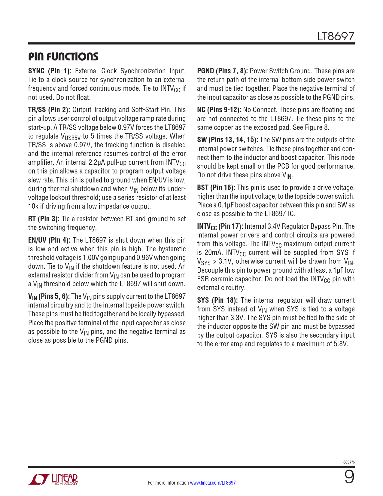 LT8697 PIN FUNCTIONS SYNC (Pin 1): External Clock Synchronization Input. PGND (Pins 7, 8): Power Switch Ground. These pins are Tie to a clock source for synchronization to an external the return path of the internal bottom side power switch frequency and forced continuous mode. Tie to INTVCC if and must be tied together. Place the negative terminal of not used. Do not float. the input capacitor as close as possible to the PGND pins. TR/SS (Pin 2): Output Tracking and Soft-Start Pin. This NC (Pins 9-12): No Connect. These pins are floating and pin allows user control of output voltage ramp rate during are not connected to the LT8697. Tie these pins to the start-up. A TR/SS voltage below 0.97V forces the LT8697 same copper as the exposed pad. See Figure 8. to regulate VUSB5V to 5 times the TR/SS voltage. When SW (Pins 13, 14, 15): The SW pins are the outputs of the TR/SS is above 0.97V, the tracking function is disabled internal power switches. Tie these pins together and con- and the internal reference resumes control of the error nect them to the inductor and boost capacitor. This node amplifier. An internal 2.2µA pull-up current from INTVCC should be kept small on the PCB for good performance. on this pin allows a capacitor to program output voltage Do not drive these pins above V slew rate. This pin is pulled to ground when EN/UV is low, IN. during thermal shutdown and when VIN below its under- BST (Pin 16): This pin is used to provide a drive voltage, voltage lockout threshold; use a series resistor of at least higher than the input voltage, to the topside power switch. 10k if driving from a low impedance output. Place a 0.1µF boost capacitor between this pin and SW as close as possible to the LT8697 IC. RT (Pin 3): Tie a resistor between RT and ground to set the switching frequency. INTVCC (Pin 17): Internal 3.4V Regulator Bypass Pin. The internal power drivers and control circuits are powered EN/UV (Pin 4): The LT8697 is shut down when this pin from this voltage. The INTV is low and active when this pin is high. The hysteretic CC maximum output current is 20mA. INTV threshold voltage is 1.00V going up and 0.96V when going CC current will be supplied from SYS if V down. Tie to V SYS > 3.1V, otherwise current will be drawn from VIN. IN if the shutdown feature is not used. An Decouple this pin to power ground with at least a 1µF low external resistor divider from VIN can be used to program ESR ceramic capacitor. Do not load the INTV a V CC pin with IN threshold below which the LT8697 will shut down. external circuitry. VIN (Pins 5, 6): The VIN pins supply current to the LT8697 SYS (Pin 18): The internal regulator will draw current internal circuitry and to the internal topside power switch. from SYS instead of V These pins must be tied together and be locally bypassed. IN when SYS is tied to a voltage higher than 3.3V. The SYS pin must be tied to the side of Place the positive terminal of the input capacitor as close the inductor opposite the SW pin and must be bypassed as possible to the VIN pins, and the negative terminal as by the output capacitor. SYS is also the secondary input close as possible to the PGND pins. to the error amp and regulates to a maximum of 5.8V. 8697fb For more information www.linear.com/LT8697 9 Document Outline Features Applications Typical Application Absolute Maximum Ratings Order Information Electrical Characteristics Typical Performance Characteristics Pin Functions Block Diagram Operation Applications Information Typical Applications Package Description Revision History Typical Application Related Parts
