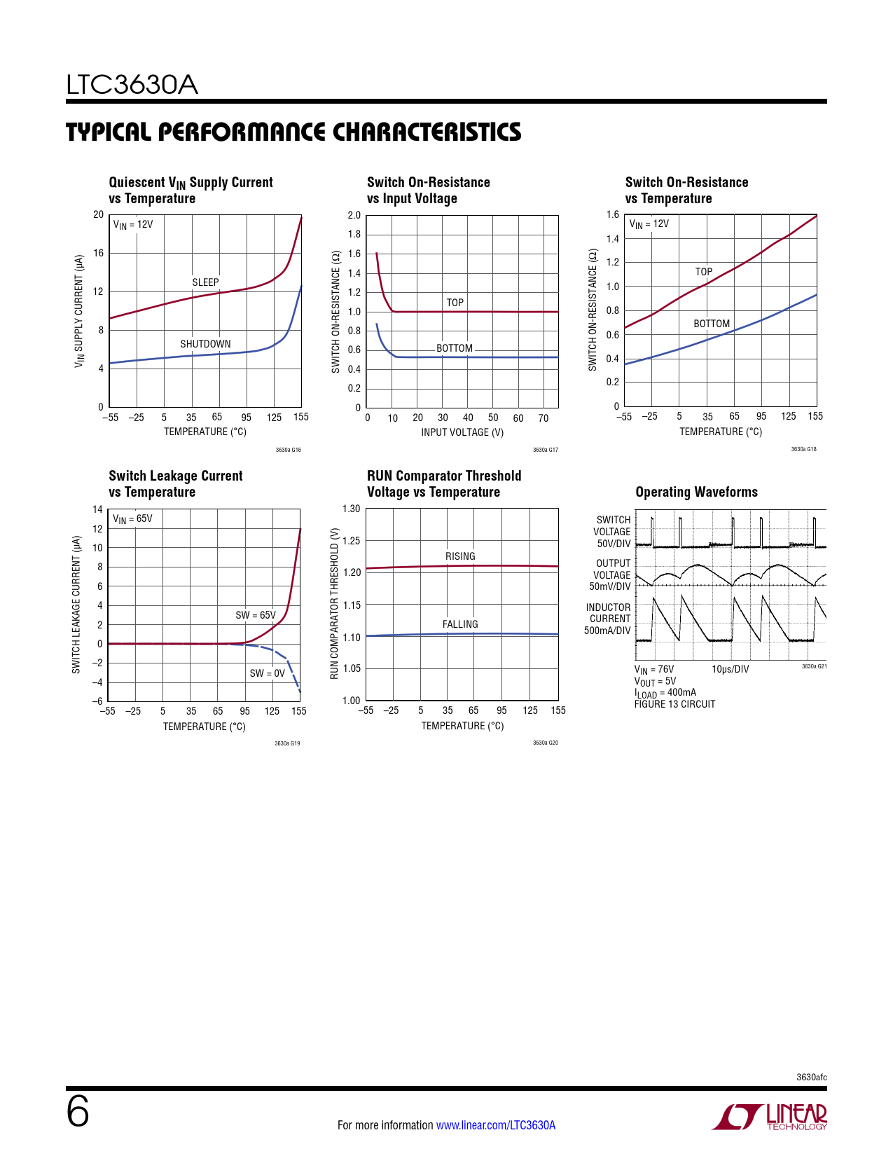 Switch Leakage Current RUN Comparator Threshold vs Temperature Voltage vs Temperature Operating Waveforms