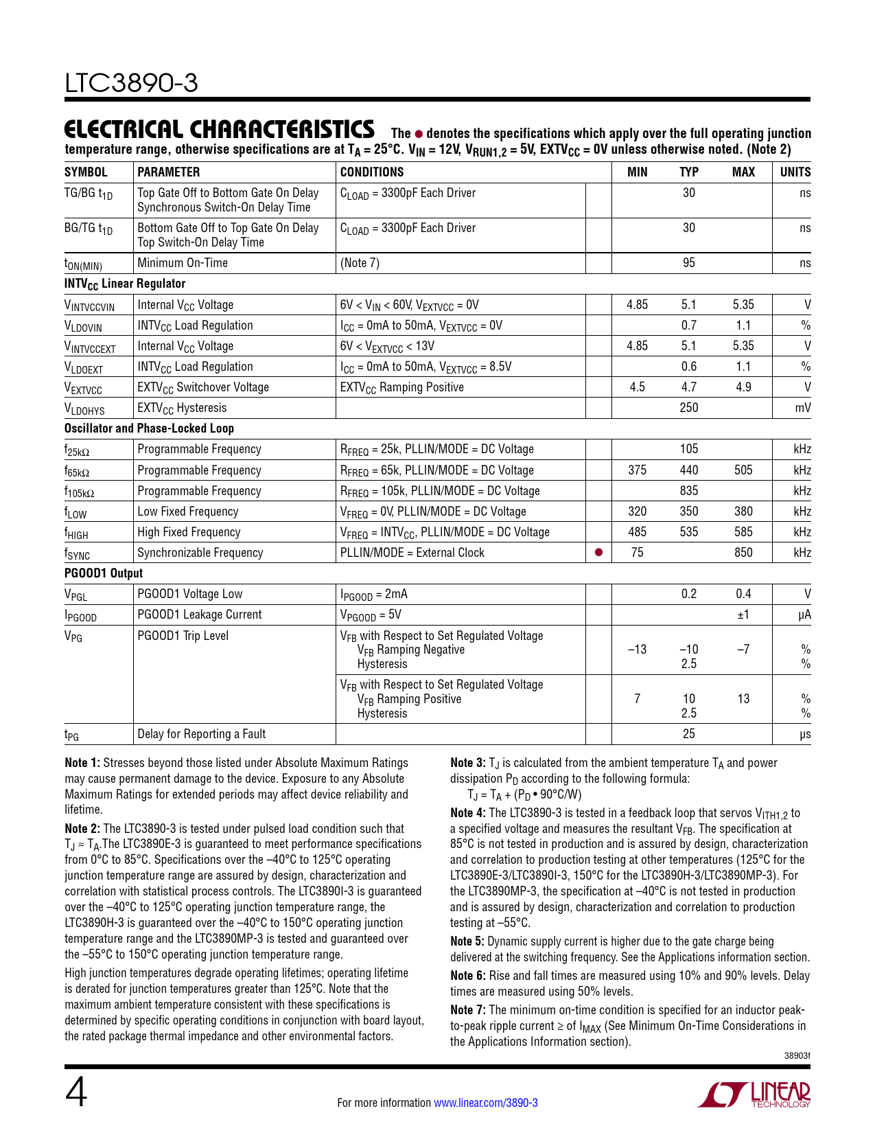 LTC3890-3 elecTrical characTerisTicsThe l denotes the specifications which apply over the full operating junctiontemperature range, otherwise specifications are at TA = 25°C. VIN = 12V, VRUN1,2 = 5V, EXTVCC = 0V unless otherwise noted. (Note 2)SYMBOLPARAMETERCONDITIONSMINTYPMAXUNITS TG/BG t1D Top Gate Off to Bottom Gate On Delay CLOAD = 3300pF Each Driver 30 ns Synchronous Switch-On Delay Time BG/TG t1D Bottom Gate Off to Top Gate On Delay CLOAD = 3300pF Each Driver 30 ns Top Switch-On Delay Time tON(MIN) Minimum On-Time (Note 7) 95 ns INTVCC Linear Regulator VINTVCCVIN Internal VCC Voltage 6V < VIN < 60V, VEXTVCC = 0V 4.85 5.1 5.35 V VLDOVIN INTVCC Load Regulation ICC = 0mA to 50mA, VEXTVCC = 0V 0.7 1.1 % VINTVCCEXT Internal VCC Voltage 6V < VEXTVCC < 13V 4.85 5.1 5.35 V VLDOEXT INTVCC Load Regulation ICC = 0mA to 50mA, VEXTVCC = 8.5V 0.6 1.1 % VEXTVCC EXTVCC Switchover Voltage EXTVCC Ramping Positive 4.5 4.7 4.9 V VLDOHYS EXTVCC Hysteresis 250 mV Oscillator and Phase-Locked Loop f25kΩ Programmable Frequency RFREQ = 25k, PLLIN/MODE = DC Voltage 105 kHz f65kΩ Programmable Frequency RFREQ = 65k, PLLIN/MODE = DC Voltage 375 440 505 kHz f105kΩ Programmable Frequency RFREQ = 105k, PLLIN/MODE = DC Voltage 835 kHz fLOW Low Fixed Frequency VFREQ = 0V, PLLIN/MODE = DC Voltage 320 350 380 kHz fHIGH High Fixed Frequency VFREQ = INTVCC, PLLIN/MODE = DC Voltage 485 535 585 kHz fSYNC Synchronizable Frequency PLLIN/MODE = External Clock l 75 850 kHz PGOOD1 Output VPGL PGOOD1 Voltage Low IPGOOD = 2mA 0.2 0.4 V IPGOOD PGOOD1 Leakage Current VPGOOD = 5V ±1 µA VPG PGOOD1 Trip Level VFB with Respect to Set Regulated Voltage VFB Ramping Negative –13 –10 –7 % Hysteresis 2.5 % VFB with Respect to Set Regulated Voltage VFB Ramping Positive 7 10 13 % Hysteresis 2.5 % tPG Delay for Reporting a Fault 25 µs Note 1: Stresses beyond those listed under Absolute Maximum Ratings Note 3: TJ is calculated from the ambient temperature TA and power may cause permanent damage to the device. Exposure to any Absolute dissipation PD according to the following formula: Maximum Ratings for extended periods may affect device reliability and TJ = TA + (PD • 90°C/W) lifetime. Note 4: The LTC3890-3 is tested in a feedback loop that servos VITH1,2 to Note 2: The LTC3890-3 is tested under pulsed load condition such that a specified voltage and measures the resultant VFB. The specification at TJ ≈ TA.The LTC3890E-3 is guaranteed to meet performance specifications 85°C is not tested in production and is assured by design, characterization from 0°C to 85°C. Specifications over the –40°C to 125°C operating and correlation to production testing at other temperatures (125°C for the junction temperature range are assured by design, characterization and LTC3890E-3/LTC3890I-3, 150°C for the LTC3890H-3/LTC3890MP-3). For correlation with statistical process controls. The LTC3890I-3 is guaranteed the LTC3890MP-3, the specification at –40°C is not tested in production over the –40°C to 125°C operating junction temperature range, the and is assured by design, characterization and correlation to production LTC3890H-3 is guaranteed over the –40°C to 150°C operating junction testing at –55°C. temperature range and the LTC3890MP-3 is tested and guaranteed over Note 5: Dynamic supply current is higher due to the gate charge being the –55°C to 150°C operating junction temperature range. delivered at the switching frequency. See the Applications information section. High junction temperatures degrade operating lifetimes; operating lifetime Note 6: Rise and fall times are measured using 10% and 90% levels. Delay is derated for junction temperatures greater than 125°C. Note that the times are measured using 50% levels. maximum ambient temperature consistent with these specifications is Note 7: The minimum on-time condition is specified for an inductor peak- determined by specific operating conditions in conjunction with board layout, to-peak ripple current ≥ of I the rated package thermal impedance and other environmental factors. MAX (See Minimum On-Time Considerations in the Applications Information section). 38903f 4 For more information www.linear.com/3890-3 Document Outline Features Description Applications Typical Application Absolute Maximum Ratings Typical Performance Characteristics Operation Package Description Typical Application