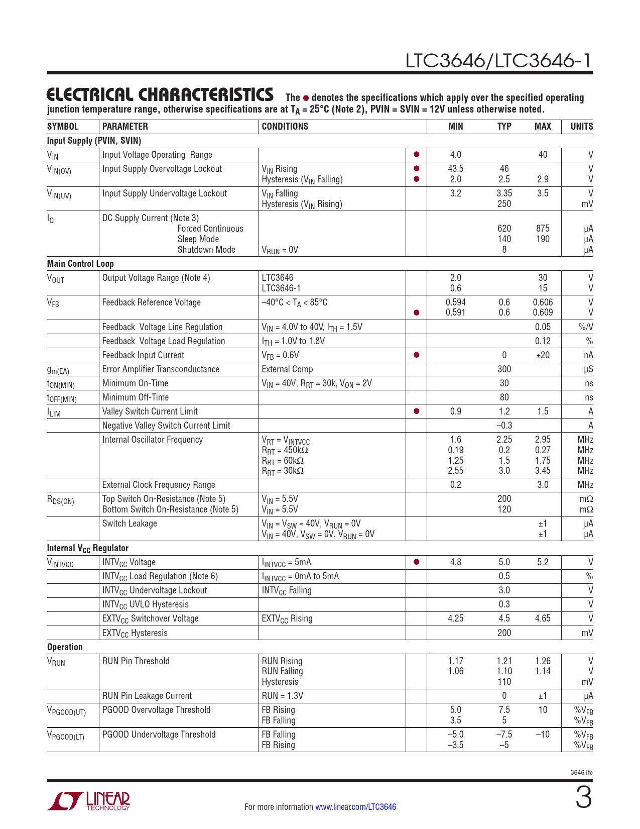 VOUT Output Voltage Range (Note 4) LTC3646 2.0 30 V LTC3646-1 0.6 15 V VFB Feedback Reference Voltage –40°C < TA < 85°C 0.594 0.6 0.606 V l 0.591 0.6 0.609 V Feedback Voltage Line Regulation VIN = 4.0V to 40V, ITH = 1.5V 0.05 %/V Feedback Voltage Load Regulation ITH = 1.0V to 1.8V 0.12 % Feedback Input Current VFB = 0.6V l 0 ±20 nA gm(EA) Error Amplifier Transconductance External Comp 300 µS tON(MIN) Minimum On-Time VIN = 40V, RRT = 30k, VON = 2V 30 ns tOFF(MIN) Minimum Off-Time 80 ns ILIM Valley Switch Current Limit l 0.9 1.2 1.5 A Negative Valley Switch Current Limit –0.3 A Internal Oscillator Frequency VRT = VINTVCC 1.6 2.25 2.95 MHz RRT = 450kΩ 0.19 0.2 0.27 MHz RRT = 60kΩ 1.25 1.5 1.75 MHz RRT = 30kΩ 2.55 3.0 3.45 MHz External Clock Frequency Range 0.2 3.0 MHz RDS(ON) Top Switch On-Resistance (Note 5) VIN = 5.5V 200 mΩ Bottom Switch On-Resistance (Note 5) VIN = 5.5V 120 mΩ Switch Leakage VIN = VSW = 40V, VRUN = 0V ±1 µA VIN = 40V, VSW = 0V, VRUN = 0V ±1 µA