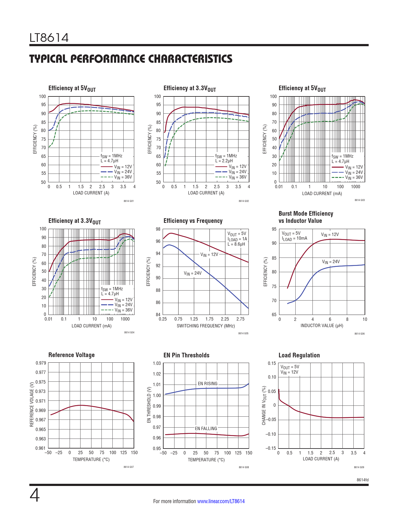 100 98 95 V VOUT = 5V V 90 OUT = 5V I IN = 12V 96 ILOAD = 1A LOAD = 10mA 90 80 L = 8.6µH 70 94 VIN = 12V 85 60 VIN = 24V 92 50 V 80 IN = 24V 40 90 EFFICIENCY (%) EFFICIENCY (%) EFFICIENCY (%) 30 f 75 SW = 1MHz 88 L = 4.7µH 20 VIN = 12V 86 70 10 VIN = 24V VIN = 36V 0 84 65 0.01 0.1 1 10 100 1000 0.25 0.75 1.25 1.75 2.25 2.75 0 2 4 6 8 10 LOAD CURRENT (mA) SWITCHING FREQUENCY (MHz) INDUCTOR VALUE (µH) 8614 G04 8614 G05 8614 G06