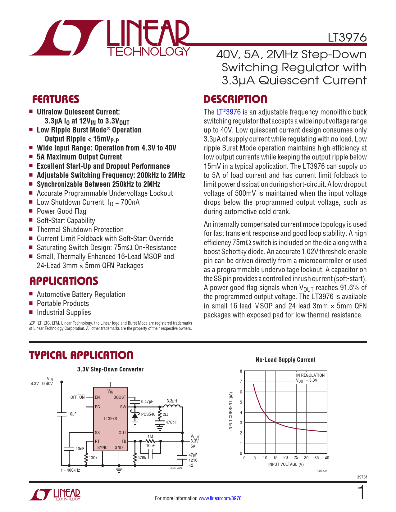 LT3976 40V, 5A, 2MHz Step-Down Switching Regulator with 3.3µA Quiescent Current