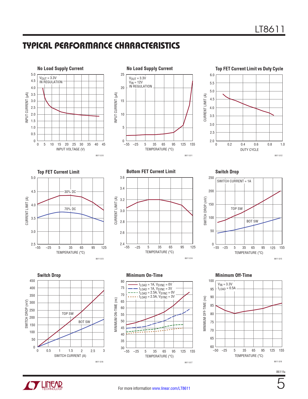5.0 25 6.0 V V 4.5 OUT = 3.3V OUT = 3.3V IN REGULATION VIN = 12V 5.5 4.0 20 IN REGULATION 5.0 3.5 3.0 15 4.5 2.5 4.0 2.0 10 3.5 INPUT CURRENT (µA) 1.5 INPUT CURRENT (µA) CURRENT LIMIT (A) 3.0 1.0 5 0.5 2.5 0 0 2.0 0 5 10 15 20 25 30 35 40 45 –55 –25 5 35 65 95 125 155 0 0.2 0.4 0.6 0.8 1.0 INPUT VOLTAGE (V) TEMPERATURE (°C) DUTY CYCLE 8611 G10 8611 G11 8611 G12