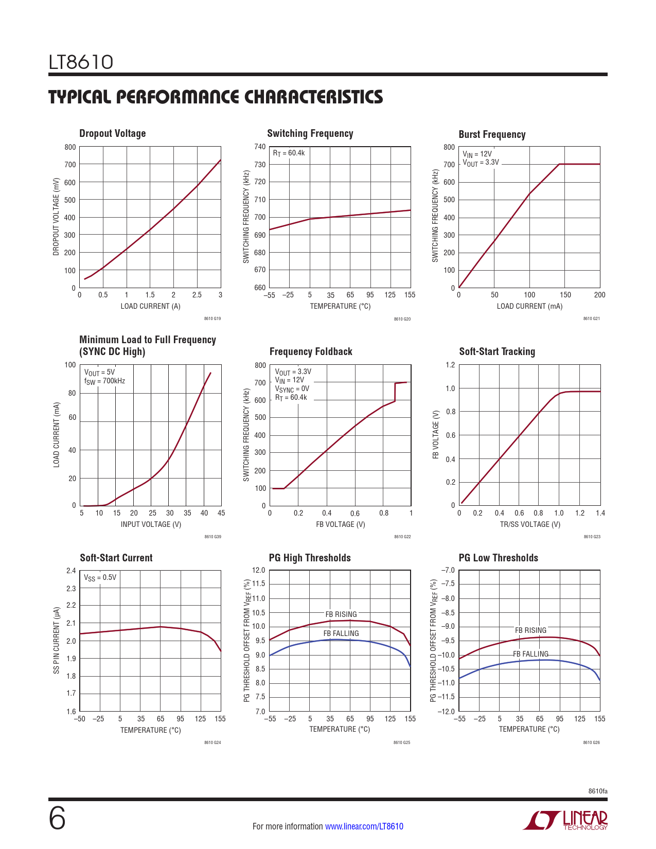 100 800 1.2 V V OUT = 5V OUT = 3.3V fSW = 700kHz 700 VIN = 12V VSYNC = 0V 1.0 80 600 RT = 60.4k 0.8 60 500 400 0.6 40 300 FB VOLTAGE (V) 0.4 LOAD CURRENT (mA) 200 20 SWITCHING FREQUENCY (kHz) 0.2 100 0 0 0 5 10 15 20 25 30 35 40 45 0 0.2 0.4 0.6 0.8 1 0 0.2 0.4 0.6 0.8 1.0 1.2 1.4 INPUT VOLTAGE (V) FB VOLTAGE (V) TR/SS VOLTAGE (V) 8610 G39 8610 G22 8610 G23