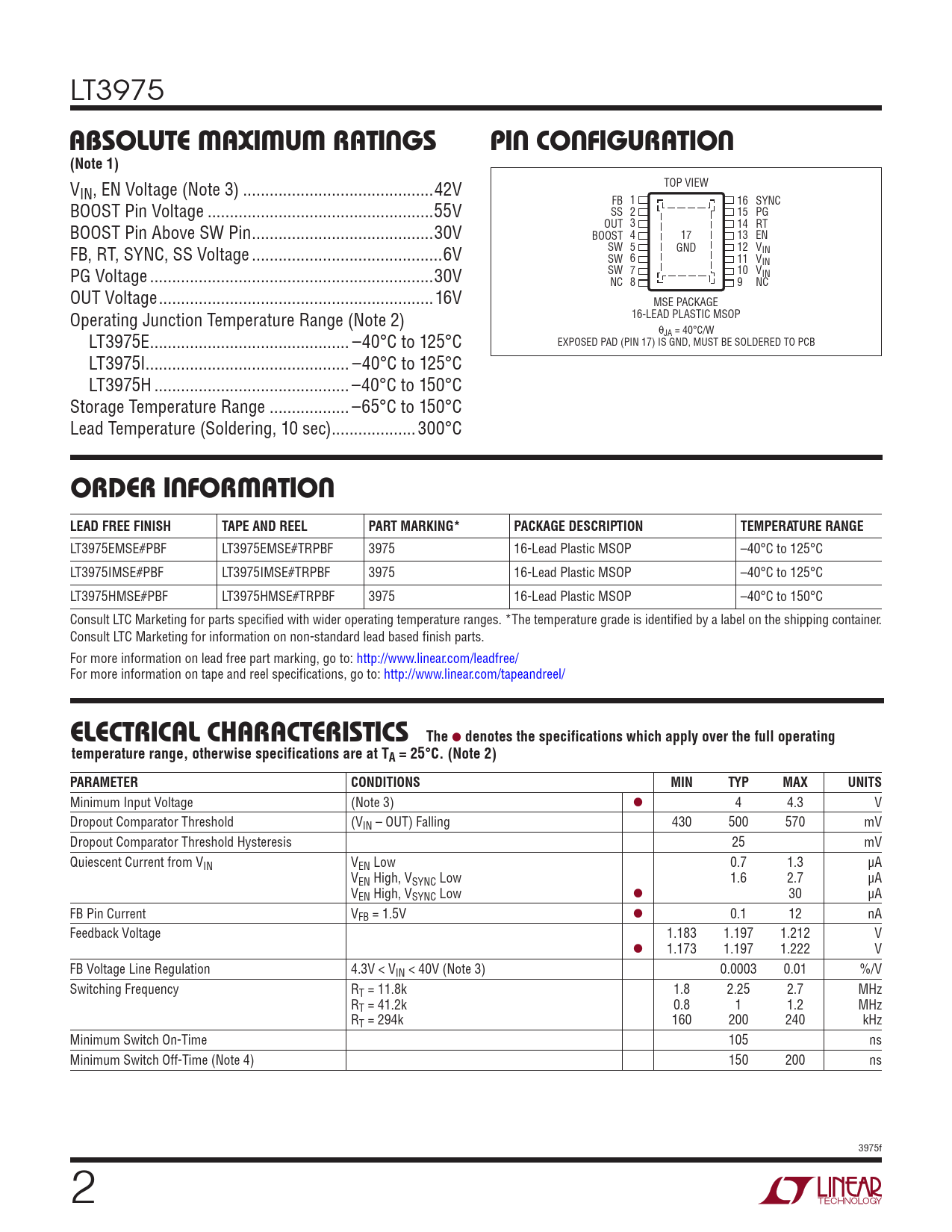 V TOP VIEW IN, EN Voltage (Note 3) ...42V BOOST Pin Voltage ...55V FB 1 16 SYNC SS 2 15 PG BOOST Pin Above SW Pin ...30V OUT 3 14 RT BOOST 4 17 13 EN FB, RT, SYNC, SS Voltage ...6V SW 5 GND 12 VIN SW 6 11 VIN PG Voltage ..30V SW 7 10 VIN NC 8 9 NC OUT Voltage ..16V MSE PACKAGE Operating Junction Temperature Range (Note 2) 16-LEAD PLASTIC MSOP LT3975E ... –40°C to 125°C θJA = 40°C/W EXPOSED PAD (PIN 17) IS GND, MUST BE SOLDERED TO PCB LT3975I.. –40°C to 125°C LT3975H .. –40°C to 150°C Storage Temperature Range .. –65°C to 150°C Lead Temperature (Soldering, 10 sec) ...300°C