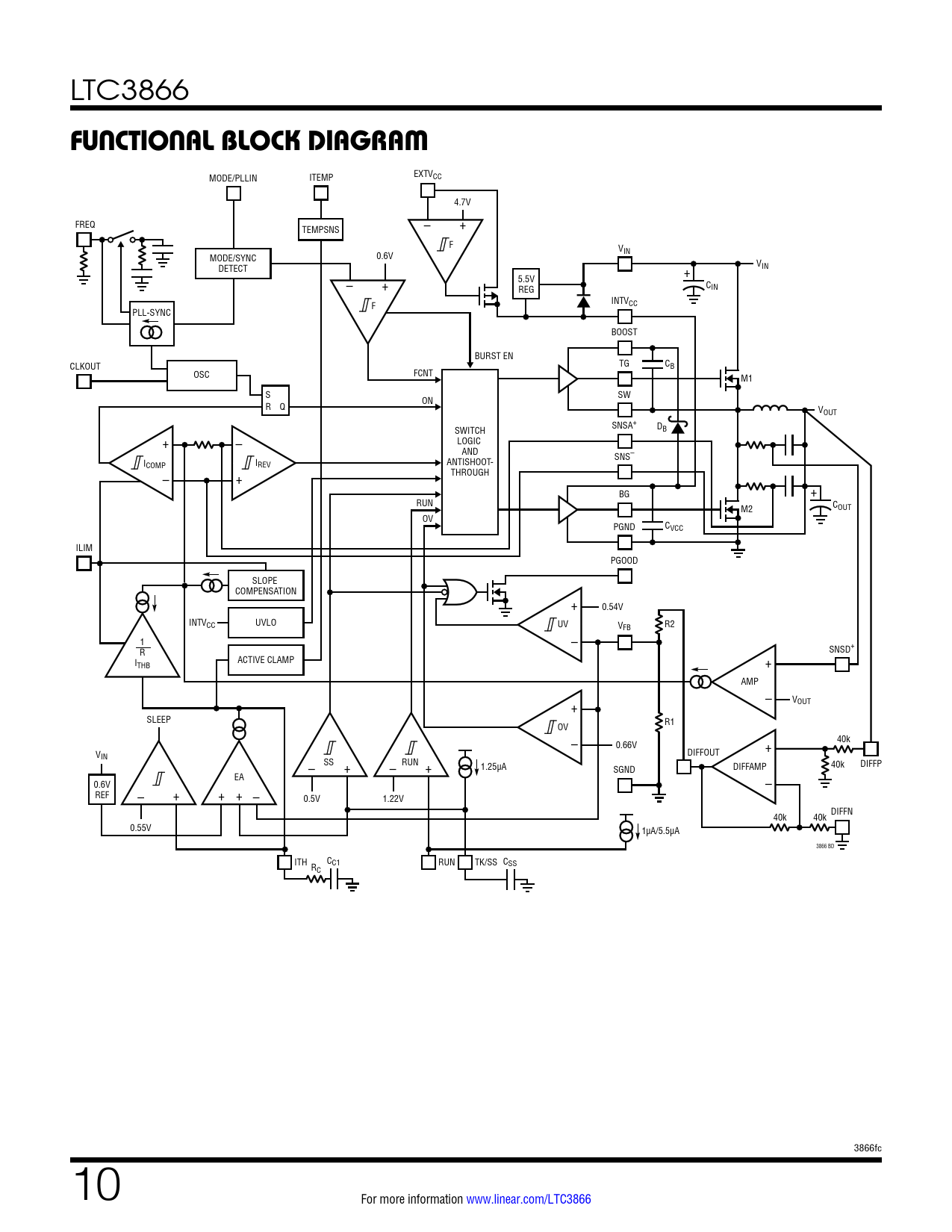 MODE/PLLIN ITEMP EXTVCC 4.7V FREQ TEMPSNS – + F VIN MODE/SYNC 0.6V DETECT VIN + – + 5.5V REG CIN F INTVCC PLL-SYNC BOOST BURST EN CLKOUT TG CB OSC FCNT M1 S SW ON R Q VOUT SNSA+ DB SWITCH + – LOGIC AND SNS– ICOMP IREV ANTISHOOT- – + THROUGH BG + RUN M2 COUT OV PGND CVCC ILIM PGOOD SLOPE COMPENSATION + 0.54V INTVCC UVLO UV V R2 FB 1 – R SNSD+ ACTIVE CLAMP ITHB + AMP – V + OUT SLEEP OV R1 – 40k 0.66V + VIN – DIFFOUT SS + – RUN + 1.25µA DIFFAMP 40k DIFFP SGND EA 0.6V – + + + – – REF 0.5V 1.22V DIFFN 40k 40k 0.55V 1µA/5.5µA 3866 BD ITH C R C1 RUN TK/SS CSS C 3866fc 10 For more information www.linear.com/LTC3866 Document Outline Features Applications Description Typical Application Absolute Maximum Ratings Pin Configuration Order Information Electrical Characteristics Typical Performance Characteristics Pin Functions Functional Block Diagram Operation Applications Information Typical Applications Package Description Revision History Typical Application Related Parts