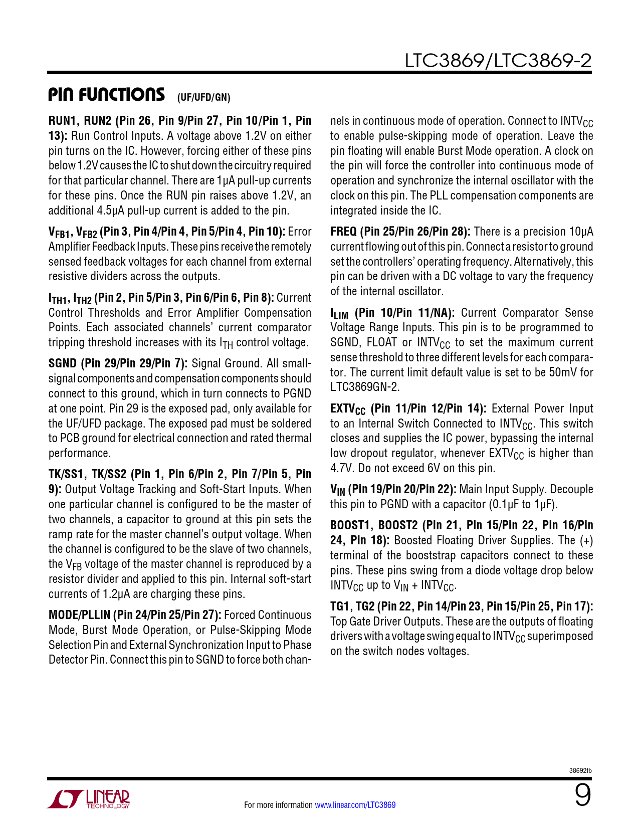 LTC3869/LTC3869-2 pin FuncTions (UF/UFD/GN)RUN1, RUN2 (Pin 26, Pin 9/Pin 27, Pin 10/Pin 1, Pin nels in continuous mode of operation. Connect to INTVCC 13): Run Control Inputs. A voltage above 1.2V on either to enable pulse-skipping mode of operation. Leave the pin turns on the IC. However, forcing either of these pins pin floating will enable Burst Mode operation. A clock on below 1.2V causes the IC to shut down the circuitry required the pin will force the controller into continuous mode of for that particular channel. There are 1µA pull-up currents operation and synchronize the internal oscillator with the for these pins. Once the RUN pin raises above 1.2V, an clock on this pin. The PLL compensation components are additional 4.5µA pull-up current is added to the pin. integrated inside the IC. VFB1, VFB2 (Pin 3, Pin 4/Pin 4, Pin 5/Pin 4, Pin 10): Error FREQ (Pin 25/Pin 26/Pin 28): There is a precision 10µA Amplifier Feedback Inputs. These pins receive the remotely current flowing out of this pin. Connect a resistor to ground sensed feedback voltages for each channel from external set the controllers’ operating frequency. Alternatively, this resistive dividers across the outputs. pin can be driven with a DC voltage to vary the frequency I of the internal oscillator. TH1, ITH2 (Pin 2, Pin 5/Pin 3, Pin 6/Pin 6, Pin 8): Current Control Thresholds and Error Amplifier Compensation ILIM (Pin 10/Pin 11/NA): Current Comparator Sense Points. Each associated channels’ current comparator Voltage Range Inputs. This pin is to be programmed to tripping threshold increases with its ITH control voltage. SGND, FLOAT or INTVCC to set the maximum current SGND (Pin 29/Pin 29/Pin 7): Signal Ground. All small- sense threshold to three different levels for each compara- signal components and compensation components should tor. The current limit default value is set to be 50mV for connect to this ground, which in turn connects to PGND LTC3869GN-2. at one point. Pin 29 is the exposed pad, only available for EXTVCC (Pin 11/Pin 12/Pin 14): External Power Input the UF/UFD package. The exposed pad must be soldered to an Internal Switch Connected to INTVCC. This switch to PCB ground for electrical connection and rated thermal closes and supplies the IC power, bypassing the internal performance. low dropout regulator, whenever EXTVCC is higher than TK/SS1, TK/SS2 (Pin 1, Pin 6/Pin 2, Pin 7/Pin 5, Pin 4.7V. Do not exceed 6V on this pin. 9): Output Voltage Tracking and Soft-Start Inputs. When VIN (Pin 19/Pin 20/Pin 22): Main Input Supply. Decouple one particular channel is configured to be the master of this pin to PGND with a capacitor (0.1µF to 1µF). two channels, a capacitor to ground at this pin sets the BOOST1, BOOST2 (Pin 21, Pin 15/Pin 22, Pin 16/Pin ramp rate for the master channel’s output voltage. When 24, Pin 18): Boosted Floating Driver Supplies. The (+) the channel is configured to be the slave of two channels, terminal of the booststrap capacitors connect to these the VFB voltage of the master channel is reproduced by a pins. These pins swing from a diode voltage drop below resistor divider and applied to this pin. Internal soft-start INTV currents of 1.2µA are charging these pins. CC up to VIN + INTVCC. TG1, TG2 (Pin 22, Pin 14/Pin 23, Pin 15/Pin 25, Pin 17):MODE/PLLIN (Pin 24/Pin 25/Pin 27): Forced Continuous Top Gate Driver Outputs. These are the outputs of floating Mode, Burst Mode Operation, or Pulse-Skipping Mode drivers with a voltage swing equal to INTV Selection Pin and External Synchronization Input to Phase CC superimposed on the switch nodes voltages. Detector Pin. Connect this pin to SGND to force both chan- 38692fb For more information www.linear.com/LTC3869 9 Document Outline Features Applications Description Typical Application Absolute Maximum Ratings Pin Configuration Order Information Electrical Characteristics Typical Performance Characteristics Pin Functions Functional Block Diagram Operation Applications Information Typical Applications Package Description Revision History Typical Application Related Parts