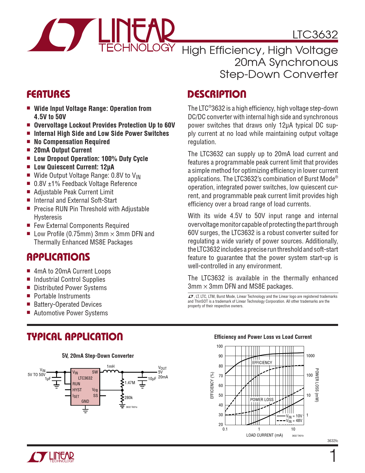 LTC3632 High Efficiency, High Voltage 20mA Synchronous Step-Down Converter FEATURESDESCRIPTION n Wide Input Voltage Range: Operation from The LTC®3632 is a high efficiency, high voltage step-down 4.5V to 50V DC/DC converter with internal high side and synchronous n Overvoltage Lockout Provides Protection Up to 60V power switches that draws only 12μA typical DC sup- n Internal High Side and Low Side Power Switches ply current at no load while maintaining output voltage n No Compensation Required regulation. n 20mA Output Current The LTC3632 can supply up to 20mA load current and n Low Dropout Operation: 100% Duty Cycle features a programmable peak current limit that provides n Low Quiescent Current: 12µA a simple method for optimizing efficiency in lower current n Wide Output Voltage Range: 0.8V to VIN applications. The LTC3632’s combination of Burst Mode® n 0.8V ±1% Feedback Voltage Reference operation, integrated power switches, low quiescent cur- n Adjustable Peak Current Limit rent, and programmable peak current limit provides high n Internal and External Soft-Start efficiency over a broad range of load currents. n Precise RUN Pin Threshold with Adjustable Hysteresis With its wide 4.5V to 50V input range and internal n Few External Components Required overvoltage monitor capable of protecting the part through n Low Profile (0.75mm) 3mm × 3mm DFN and 60V surges, the LTC3632 is a robust converter suited for Thermally Enhanced MS8E Packages regulating a wide variety of power sources. Additionally, the LTC3632 includes a precise run threshold and soft-start APPLICATIONS feature to guarantee that the power system start-up is well-controlled in any environment. n 4mA to 20mA Current Loops n Industrial Control Supplies The LTC3632 is available in the thermally enhanced n Distributed Power Systems 3mm × 3mm DFN and MS8E packages. n Portable Instruments L, LT, LTC, LTM, Burst Mode, Linear Technology and the Linear logo are registered trademarks and ThinSOT is a trademark of Linear Technology Corporation. All other trademarks are the n Battery-Operated Devices property of their respective owners. n Automotive Power Systems TYPICAL APPLICATIONEfficiency and Power Loss vs Load Current 100 5V, 20mA Step-Down Converter 90 1000 EFFICIENCY 1mH 80 POWER LOSS (mW) V VOUT IN VIN SW 5V TO 50V 5V 70 100 1µF LTC3632 10µF 20mA RUN 1.47M 60 HYST VFB ISET SS 280k EFFICIENCY (%) 50 10 GND POWER LOSS 40 3632 TA01a 30 V 1 IN = 10V VIN = 48V 200.1 1 10 LOAD CURRENT (mA) 3632 TA01b 3632fc 1 Document Outline FEATURES DESCRIPTION APPLICATIONS TYPICAL APPLICATION ABSOLUTE MAXIMUM RATINGS PIN CONFIGURATION ORDER INFORMATION ELECTRICAL CHARACTERISTICS TYPICAL PERFORMANCE CHARACTERISTICS PIN FUNCTIONS BLOCK DIAGRAM OPERATION APPLICATIONS INFORMATION TYPICAL APPLICATIONS PACKAGE DESCRIPTION REVISION HISTORY TYPICAL APPLICATION RELATED PARTS
