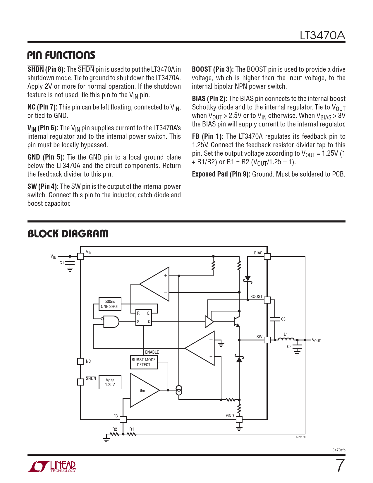 LT3470A PIN FUNCTIONSSHDN (Pin 8): The SHDN pin is used to put the LT3470A in BOOST (Pin 3): The BOOST pin is used to provide a drive shutdown mode. Tie to ground to shut down the LT3470A. voltage, which is higher than the input voltage, to the Apply 2V or more for normal operation. If the shutdown internal bipolar NPN power switch. feature is not used, tie this pin to the VIN pin. BIAS (Pin 2): The BIAS pin connects to the internal boost NC (Pin 7): This pin can be left floating, connected to VIN, Schottky diode and to the internal regulator. Tie to VOUT or tied to GND. when VOUT > 2.5V or to VIN otherwise. When VBIAS > 3V the BIAS pin will supply current to the internal regulator. VIN (Pin 6): The VIN pin supplies current to the LT3470A’s internal regulator and to the internal power switch. This FB (Pin 1): The LT3470A regulates its feedback pin to pin must be locally bypassed. 1.25V. Connect the feedback resistor divider tap to this pin. Set the output voltage according to V GND (Pin 5): Tie the GND pin to a local ground plane OUT = 1.25V (1 + R1/R2) or R1 = R2 (V below the LT3470A and the circuit components. Return OUT/1.25 – 1). the feedback divider to this pin. Exposed Pad (Pin 9): Ground. Must be soldered to PCB. SW (Pin 4): The SW pin is the output of the internal power switch. Connect this pin to the inductor, catch diode and boost capacitor. BLOCK DIAGRAM VIN BIAS VIN C1 + – BOOST 500ns ONE SHOT R Qʹ C3 S Q – L1 SW VOUT C2 ENABLE + BURST MODE NC DETECT SHDN VREF 1.25V gm FB GND R2 R1 3470a BD 3470afb 7