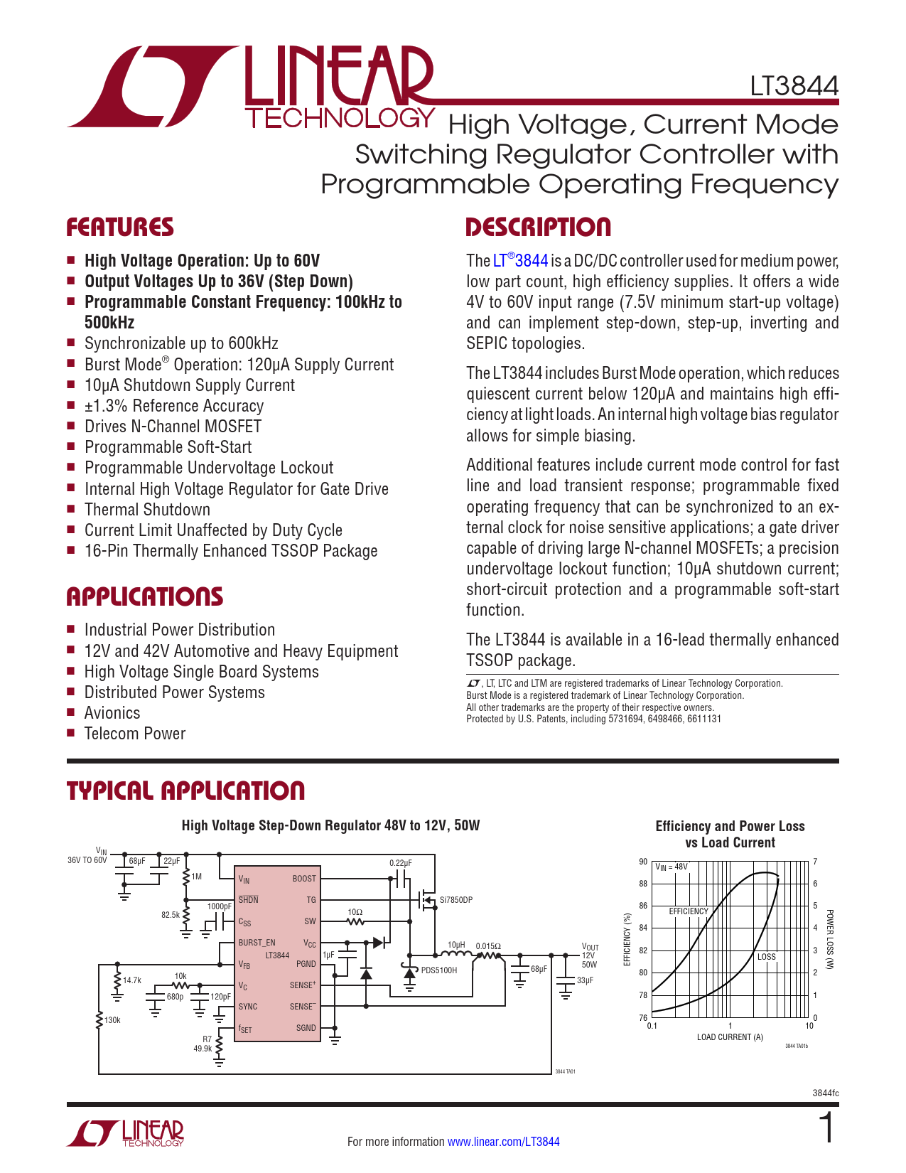 short-circuit protection and a programmable soft-start function. n Industrial Power Distribution The LT3844 is available in a 16-lead thermally enhanced n 12V and 42V Automotive and Heavy Equipment TSSOP package. n High Voltage Single Board Systems L, LT, LTC and LTM are registered trademarks of Linear Technology Corporation. n Distributed Power Systems Burst Mode is a registered trademark of Linear Technology Corporation. All other trademarks are the property of their respective owners. n Avionics Protected by U.S. Patents, including 5731694, 6498466, 6611131 n Telecom Power