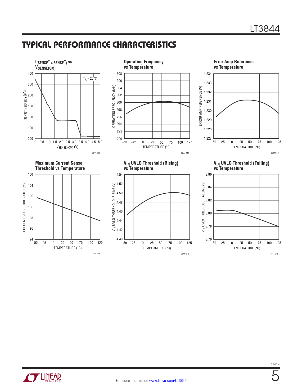 400 308 1.234 TA = 25°C 306 300 1.233 304 1.232 (µA) 200 302 – ) 1.231 300 100 + + SENSE 298 1.230 0 296 I (SENSE 1.229 294 ERROR AMP REFERENCE (V) –100 OPERATING FREQUENCY (kHz) 1.228 292 –200 290 1.227 0 0.5 1.0 1.5 2.0 2.5 3.0 3.5 4.0 4.5 5.0 –50 –25 0 25 50 75 100 125 –50 –25 0 25 50 75 100 125 VSENSE (CM) (V) TEMPERATURE (°C) TEMPERATURE (°C) 3844 G10 3844 G17 3844 G12