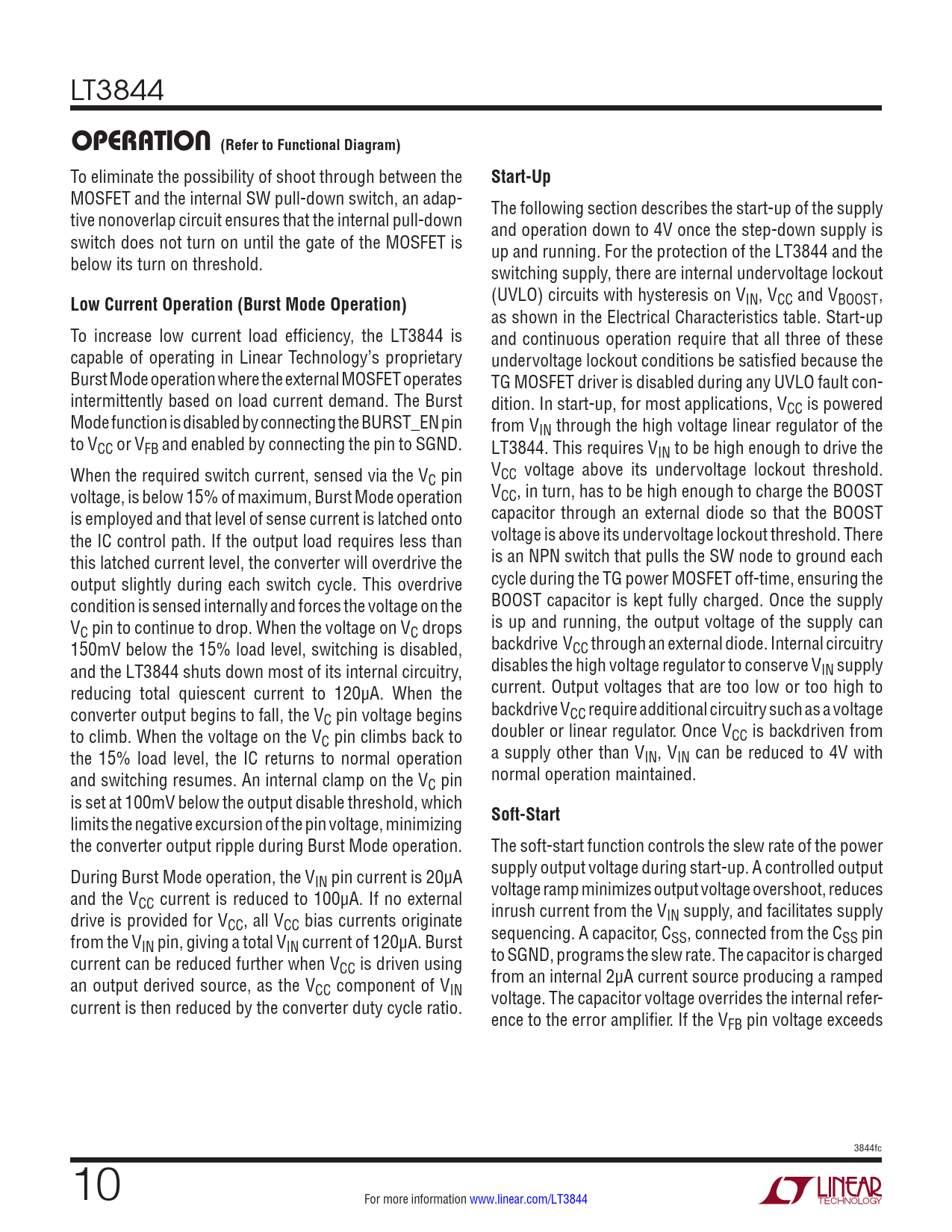 LT3844 operaTion (Refer to Functional Diagram) To eliminate the possibility of shoot through between the Start-Up MOSFET and the internal SW pull-down switch, an adap- The following section describes the start-up of the supply tive nonoverlap circuit ensures that the internal pull-down and operation down to 4V once the step-down supply is switch does not turn on until the gate of the MOSFET is up and running. For the protection of the LT3844 and the below its turn on threshold. switching supply, there are internal undervoltage lockout Low Current Operation (Burst Mode Operation) (UVLO) circuits with hysteresis on VIN, VCC and VBOOST , as shown in the Electrical Characteristics table. Start-up To increase low current load efficiency, the LT3844 is and continuous operation require that all three of these capable of operating in Linear Technology’s proprietary undervoltage lockout conditions be satisfied because the Burst Mode operation where the external MOSFET operates TG MOSFET driver is disabled during any UVLO fault con- intermittently based on load current demand. The Burst dition. In start-up, for most applications, VCC is powered Mode function is disabled by connecting the BURST_EN pin from VIN through the high voltage linear regulator of the to VCC or VFB and enabled by connecting the pin to SGND. LT3844. This requires VIN to be high enough to drive the When the required switch current, sensed via the V V C pin CC voltage above its undervoltage lockout threshold. voltage, is below 15% of maximum, Burst Mode operation VCC, in turn, has to be high enough to charge the BOOST is employed and that level of sense current is latched onto capacitor through an external diode so that the BOOST the IC control path. If the output load requires less than voltage is above its undervoltage lockout threshold. There this latched current level, the converter will overdrive the is an NPN switch that pulls the SW node to ground each output slightly during each switch cycle. This overdrive cycle during the TG power MOSFET off-time, ensuring the condition is sensed internally and forces the voltage on the BOOST capacitor is kept fully charged. Once the supply V is up and running, the output voltage of the supply can C pin to continue to drop. When the voltage on VC drops 150mV below the 15% load level, switching is disabled, backdrive VCC through an external diode. Internal circuitry and the LT3844 shuts down most of its internal circuitry, disables the high voltage regulator to conserve VIN supply reducing total quiescent current to 120µA. When the current. Output voltages that are too low or too high to converter output begins to fall, the V backdrive V C pin voltage begins CC require additional circuitry such as a voltage to climb. When the voltage on the V doubler or linear regulator. Once V C pin climbs back to CC is backdriven from the 15% load level, the IC returns to normal operation a supply other than VIN, VIN can be reduced to 4V with and switching resumes. An internal clamp on the V normal operation maintained. C pin is set at 100mV below the output disable threshold, which limits the negative excursion of the pin voltage, minimizing Soft-Start the converter output ripple during Burst Mode operation. The soft-start function controls the slew rate of the power During Burst Mode operation, the V supply output voltage during start-up. A controlled output IN pin current is 20µA and the V voltage ramp minimizes output voltage overshoot, reduces CC current is reduced to 100µA. If no external drive is provided for V inrush current from the VIN supply, and facilitates supply CC, all VCC bias currents originate from the V sequencing. A capacitor, CSS, connected from the CSS pin IN pin, giving a total VIN current of 120µA. Burst current can be reduced further when V to SGND, programs the slew rate. The capacitor is charged CC is driven using an output derived source, as the V from an internal 2µA current source producing a ramped CC component of VIN current is then reduced by the converter duty cycle ratio. voltage. The capacitor voltage overrides the internal refer- ence to the error amplifier. If the VFB pin voltage exceeds 3844fc 10 For more information www.linear.com/LT3844 Document Outline Features Applications Typical Application Description Absolute Maximum Ratings Order Information Electrical Characteristics Pin Configuration Typical Performance Characteristics Pin Functions Functional Diagram Operation Applications Information Typical Applications Package Description Revision History Typical Application Related Parts