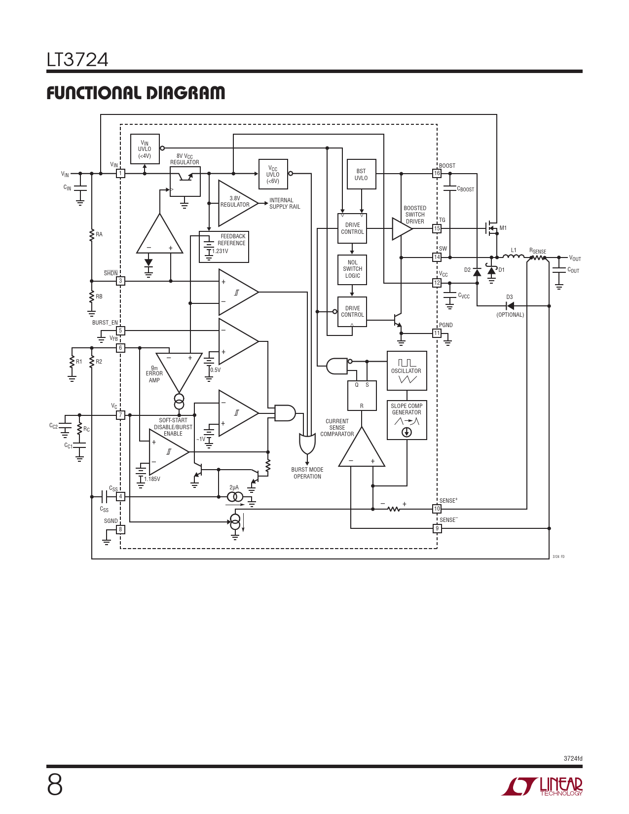 VIN UVLO (<4V) 8V VCC REGULATOR VIN V BOOST CC BST V 1 IN UVLO 16 UVLO (<6V) CIN CBOOST 3.8V INTERNAL REGULATOR SUPPLY RAIL BOOSTED SWITCH TG DRIVER DRIVE 15 M1 CONTROL RA FEEDBACK – + REFERENCE 1.231V SW L1 RSENSE 14 V NOL OUT SWITCH D2 D1 C SHDN OUT + LOGIC VCC 3 12 RB – CVCC D3 DRIVE CONTROL (OPTIONAL) BURST_EN – PGND 5 11 VFB 6 + – + R1 R2 gm 0.5V OSCILLATOR ERROR AMP Q S – VC R SLOPE COMP 7 GENERATOR SOFT-START + CURRENT CC2 DISABLE/BURST R SENSE C + ENABLE COMPARATOR ~1V CC1 – – + BURST MODE 1.185V OPERATION CSS 2µA 4 SENSE+ – + CSS 10 SGND SENSE– 8 9 3724 FD 3724fd 8