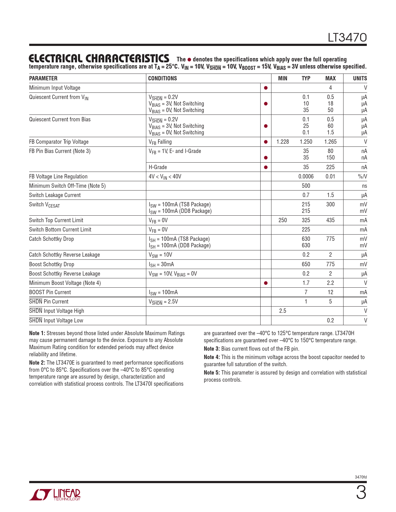 Minimum Input Voltage ● 4 V Quiescent Current from VIN VSHDN = 0.2V 0.1 0.5 µA VBIAS = 3V, Not Switching ● 10 18 µA VBIAS = 0V, Not Switching 35 50 µA Quiescent Current from Bias VSHDN = 0.2V 0.1 0.5 µA VBIAS = 3V, Not Switching ● 25 60 µA VBIAS = 0V, Not Switching 0.1 1.5 µA FB Comparator Trip Voltage VFB Falling ● 1.228 1.250 1.265 V FB Pin Bias Current (Note 3) VFB = 1V, E- and I-Grade 35 80 nA ● 35 150 nA H-Grade ● 35 225 nA FB Voltage Line Regulation 4V < VIN < 40V 0.0006 0.01 %/V Minimum Switch Off-Time (Note 5) 500 ns Switch Leakage Current 0.7 1.5 µA Switch VCESAT ISW = 100mA (TS8 Package) 215 300 mV ISW = 100mA (DD8 Package) 215 mV Switch Top Current Limit VFB = 0V 250 325 435 mA Switch Bottom Current Limit VFB = 0V 225 mA Catch Schottky Drop ISH = 100mA (TS8 Package) 630 775 mV ISH = 100mA (DD8 Package) 630 mV Catch Schottky Reverse Leakage VSW = 10V 0.2 2 µA Boost Schottky Drop ISH = 30mA 650 775 mV Boost Schottky Reverse Leakage VSW = 10V, VBIAS = 0V 0.2 2 µA Minimum Boost Voltage (Note 4) ● 1.7 2.2 V BOOST Pin Current ISW = 100mA 7 12 mA SHDN Pin Current VSHDN = 2.5V 1 5 µA SHDN Input Voltage High 2.5 V SHDN Input Voltage Low 0.2 V