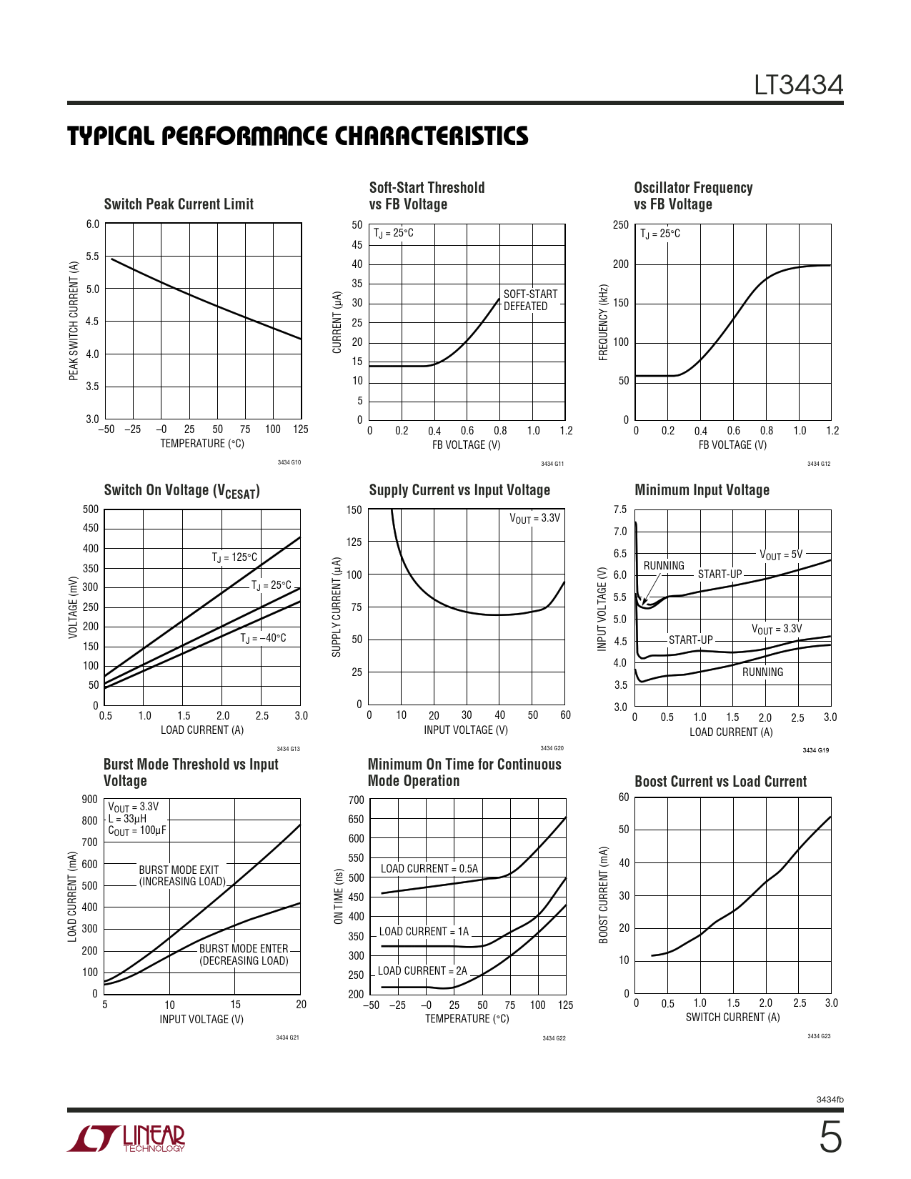 6.0 50 250 TJ = 25°C TJ = 25°C 45 5.5 40 200 35 5.0 SOFT-START µA) 30 DEFEATED 150 4.5 25 20 100 4.0 CURRENT ( 15 FREQUENCY (kHz) PEAK SWITCH CURRENT (A) 10 50 3.5 5 3.0 0 0 –50 –25 –0 25 50 75 100 125 0 0.2 0.4 0.6 0.8 1.0 1.2 0 0.2 0.4 0.6 0.8 1.0 1.2 TEMPERATURE (°C) FB VOLTAGE (V) FB VOLTAGE (V) 3434 G10 3434 G11 3434 G12