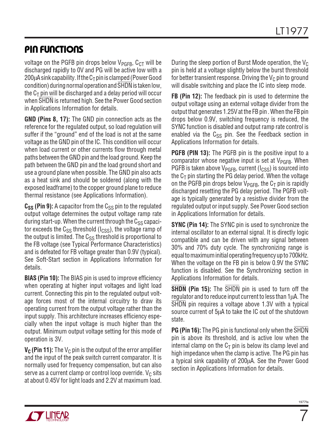 LT1977 UUUPI FU CTIO S voltage on the PGFB pin drops below VPGFB, CCT will be During the sleep portion of Burst Mode operation, the VC discharged rapidly to 0V and PG will be active low with a pin is held at a voltage slightly below the burst threshold 200µA sink capability. If the CT pin is clamped (Power Good for better transient response. Driving the VC pin to ground condition) during normal operation and SHDN is taken low, will disable switching and place the IC into sleep mode. the CT pin will be discharged and a delay period will occur FB (Pin 12): The feedback pin is used to determine the when SHDN is returned high. See the Power Good section output voltage using an external voltage divider from the in Applications Information for details. output that generates 1.25V at the FB pin . When the FB pin GND (Pins 8, 17): The GND pin connection acts as the drops below 0.9V, switching frequency is reduced, the reference for the regulated output, so load regulation will SYNC function is disabled and output ramp rate control is suffer if the “ground” end of the load is not at the same enabled via the CSS pin. See the Feedback section in voltage as the GND pin of the IC. This condition will occur Applications Information for details. when load current or other currents flow through metal PGFB (PIN 13): The PGFB pin is the positive input to a paths between the GND pin and the load ground. Keep the comparator whose negative input is set at V path between the GND pin and the load ground short and PGFB. When PGFB is taken above V use a ground plane when possible. The GND pin also acts PGFB, current (ICSS) is sourced into the C as a heat sink and should be soldered (along with the T pin starting the PG delay period. When the voltage on the PGFB pin drops below V exposed leadframe) to the copper ground plane to reduce PGFB, the CT pin is rapidly discharged resetting the PG delay period. The PGFB volt- thermal resistance (see Applications Information). age is typically generated by a resistive divider from the CSS (Pin 9): A capacitor from the CSS pin to the regulated regulated output or input supply. See Power Good section output voltage determines the output voltage ramp rate in Applications Information for details. during start-up. When the current through the CSS capaci- SYNC (Pin 14): The SYNC pin is used to synchronize the tor exceeds the CSS threshold (ICSS), the voltage ramp of internal oscillator to an external signal. It is directly logic the output is limited. The CSS threshold is proportional to compatible and can be driven with any signal between the FB voltage (see Typical Performance Characteristics) 30% and 70% duty cycle. The synchronizing range is and is defeated for FB voltage greater than 0.9V (typical). equal to maximum initial operating frequency up to 700kHz. See Soft-Start section in Applications Information for When the voltage on the FB pin is below 0.9V the SYNC details. function is disabled. See the Synchronizing section in BIAS (Pin 10): The BIAS pin is used to improve efficiency Applications Information for details. when operating at higher input voltages and light load SHDN (Pin 15): The SHDN pin is used to turn off the current. Connecting this pin to the regulated output volt- regulator and to reduce input current to less than 1µA. The age forces most of the internal circuitry to draw its SHDN pin requires a voltage above 1.3V with a typical operating current from the output voltage rather than the source current of 5µA to take the IC out of the shutdown input supply. This architecture increases efficiency espe- state. cially when the input voltage is much higher than the output. Minimum output voltage setting for this mode of PG (Pin 16): The PG pin is functional only when the SHDN operation is 3V. pin is above its threshold, and is active low when the internal clamp on the C V T pin is below its clamp level and C (Pin 11): The VC pin is the output of the error amplifier high impedance when the clamp is active. The PG pin has and the input of the peak switch current comparator. It is a typical sink capability of 200µA. See the Power Good normally used for frequency compensation, but can also section in Applications Information for details. serve as a current clamp or control loop override. VC sits at about 0.45V for light loads and 2.2V at maximum load. 1977fa 7