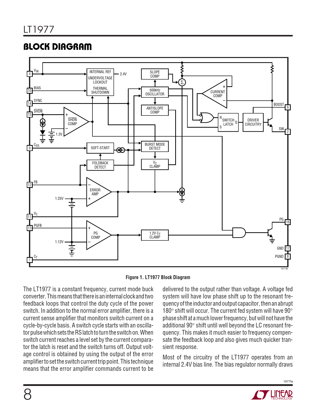 LT1977 WBLOCK DIAGRA VIN INTERNAL REF SLOPE 4 2.4V COMP UNDERVOLTAGE LOCKOUT Σ + BIAS THERMAL 10 500kHz SHUTDOWN CURRENT OSCILLATOR COMP SYNC – 14 BOOST ANTISLOPE 6 SHDN COMP 15 + R SHDN SWITCH DRIVER COMP Q LATCH CIRCUITRY – S SW 2 1.3V CSS BURST MODE 9 SOFT-START DETECT FOLDBACK VC DETECT CLAMP FB – 12 ERROR + AMP 1.25V VC 11 PG 16 PGFB 13 + PG 1.2V CT COMP CLAMP 1.12V – GND 17 CT PGND 8 7 1977 BD Figure 1. LT1977 Block Diagram The LT1977 is a constant frequency, current mode buck delivered to the output rather than voltage. A voltage fed converter. This means that there is an internal clock and two system will have low phase shift up to the resonant fre- feedback loops that control the duty cycle of the power quency of the inductor and output capacitor, then an abrupt switch. In addition to the normal error amplifier, there is a 180° shift will occur. The current fed system will have 90° current sense amplifier that monitors switch current on a phase shift at a much lower frequency, but will not have the cycle-by-cycle basis. A switch cycle starts with an oscilla- additional 90° shift until well beyond the LC resonant fre- tor pulse which sets the RS latch to turn the switch on. When quency. This makes it much easier to frequency compen- switch current reaches a level set by the current compara- sate the feedback loop and also gives much quicker tran- tor the latch is reset and the switch turns off. Output volt- sient response. age control is obtained by using the output of the error Most of the circuitry of the LT1977 operates from an amplifier to set the switch current trip point. This technique internal 2.4V bias line. The bias regulator normally draws means that the error amplifier commands current to be 1977fa 8