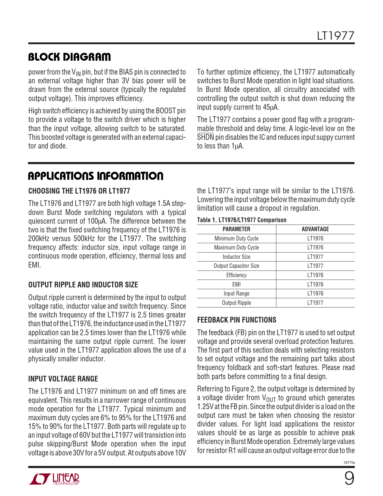BLOCK DIAGRA. APPLICATIO S I FOR ATIO. CHOOSING THE LT1976 OR LT1977. Table 1. LT1976/LT1977 Comparison. PARAMETER. ADVANTAGE