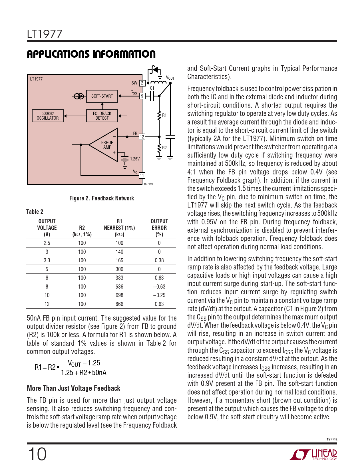 LT1977 UUWUAPPLICATIO S I FOR ATIO and Soft-Start Current graphs in Typical Performance VOUT LT1977 Characteristics). SW 2 C1 Frequency foldback is used to control power dissipation in CSS SOFT-START 9 both the IC and in the external diode and inductor during short-circuit conditions. A shorted output requires the 500kHz FOLDBACK R1 switching regulator to operate at very low duty cycles. As OSCILLATOR DETECT a result the average current through the diode and induc- tor is equal to the short-circuit current limit of the switch – FB 12 (typically 2A for the LT1977). Minimum switch on time ERROR AMP R2 limitations would prevent the switcher from operating at a + sufficiently low duty cycle if switching frequency were 1.25V maintained at 500kHz, so frequency is reduced by about VC 4:1 when the FB pin voltage drops below 0.4V (see 11 Frequency Foldback graph). In addition, if the current in 1977 F02 the switch exceeds 1.5 times the current limitations speci- Figure 2. Feedback Network fied by the VC pin, due to minimum switch on time, the LT1977 will skip the next switch cycle. As the feedback Table 2 voltage rises, the switching frequency increases to 500kHz OUTPUTR1OUTPUT with 0.95V on the FB pin. During frequency foldback, VOLTAGER2NEAREST (1%)ERROR external synchronization is disabled to prevent interfer- (V)(k Ω , 1%)(k Ω )(%) ence with foldback operation. Frequency foldback does 2.5 100 100 0 not affect operation during normal load conditions. 3 100 140 0 3.3 100 165 0.38 In addition to lowering switching frequency the soft-start ramp rate is also affected by the feedback voltage. Large 5 100 300 0 capacitive loads or high input voltages can cause a high 6 100 383 0.63 input current surge during start-up. The soft-start func- 8 100 536 – 0.63 tion reduces input current surge by regulating switch 10 100 698 – 0.25 current via the VC pin to maintain a constant voltage ramp 12 100 866 0.63 rate (dV/dt) at the output. A capacitor (C1 in Figure 2) from 50nA FB pin input current. The suggested value for the the CSS pin to the output determines the maximum output output divider resistor (see Figure 2) from FB to ground dV/dt. When the feedback voltage is below 0.4V, the VC pin (R2) is 100k or less. A formula for R1 is shown below. A will rise, resulting in an increase in switch current and table of standard 1% values is shown in Table 2 for output voltage. If the dV/dt of the output causes the current common output voltages. through the CSS capacitor to exceed ICSS the VC voltage is reduced resulting in a constant dV/dt at the output. As the V – 1.25 R = R OUT 1 2 • feedback voltage increases ICSS increases, resulting in an 1.25 + R2 • 5 n 0 A increased dV/dt until the soft-start function is defeated with 0.9V present at the FB pin. The soft-start function More Than Just Voltage Feedback does not affect operation during normal load conditions. The FB pin is used for more than just output voltage However, if a momentary short (brown out condition) is sensing. It also reduces switching frequency and con- present at the output which causes the FB voltage to drop trols the soft-start voltage ramp rate when output voltage below 0.9V, the soft-start circuitry will become active. is below the regulated level (see the Frequency Foldback 1977fa 10
