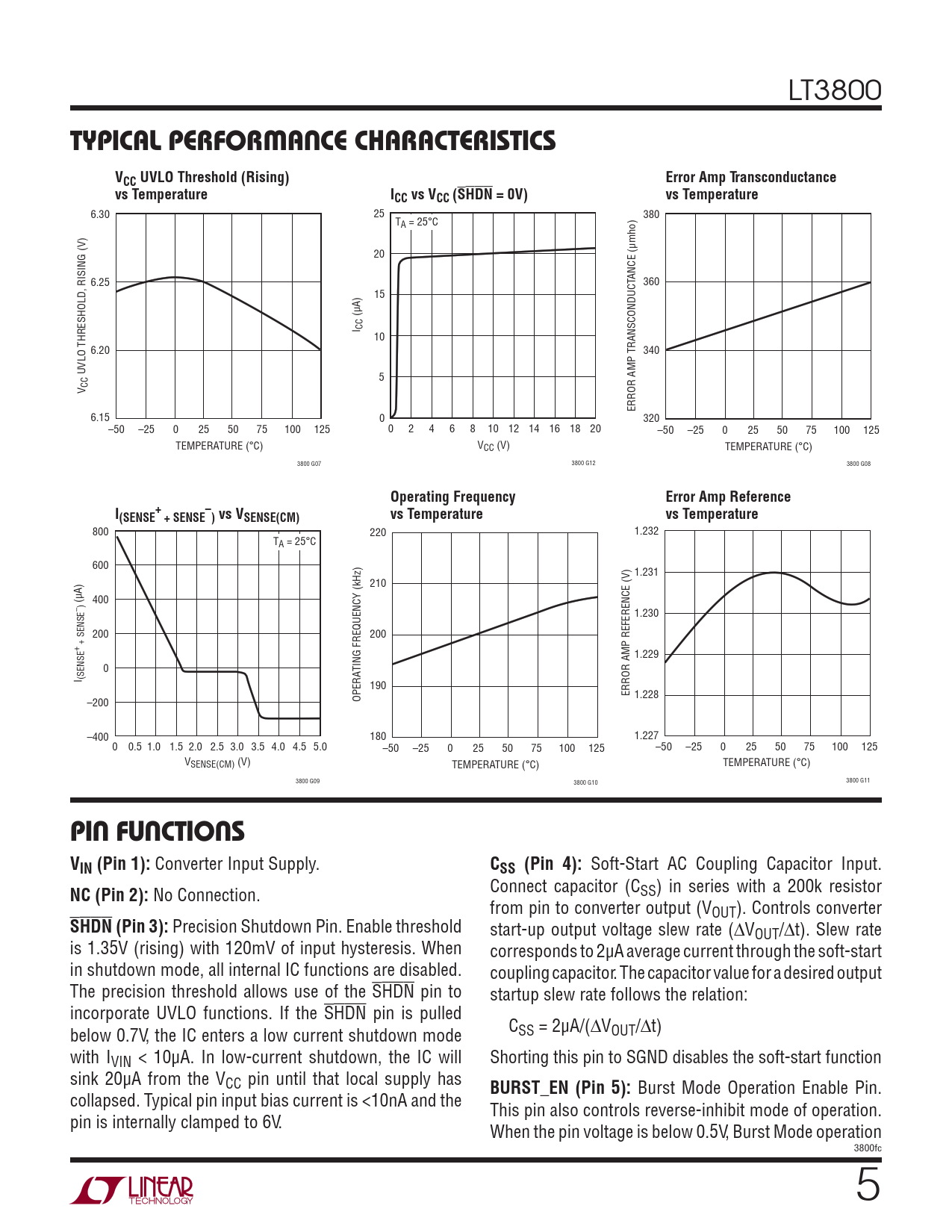 LT3800 TYPICAL PERFORMANCE CHARACTERISTICSVCC UVLO Threshold (Rising)Error Amp Transconductancevs TemperatureICC vs VCC (SHDN = 0V)vs Temperature 6.30 25 380 TA = 25°C 20 ANCE (μmho) 6.25 360 15 (μA) I CC 10 6.20 340 UVLO THRESHOLD, RISING (V) 5 CCV ERROR AMP TRANSCONDUCT 6.15 0 320 –50 –25 0 25 50 75 100 125 0 2 4 6 8 10 12 14 16 18 20 –50 –25 0 25 50 75 100 125 TEMPERATURE (°C) VCC (V) TEMPERATURE (°C) 3800 G07 3800 G12 3800 G08 Operating FrequencyError Amp ReferenceI+–(SENSE + SENSE ) vs VSENSE(CM)vs Temperaturevs Temperature 800 220 1.232 TA = 25°C 600 1.231 210 (μA) 400 ) – 1.230 200 200 + SENSE + 1.229 0 TING FREQUENCY (kHz) I (SENSE 190 ERROR AMP REFERENCE (V) 1.228 –200 OPERA –400 180 1.227 0 0.5 1.0 1.5 2.0 2.5 3.0 3.5 4.0 4.5 5.0 –50 –25 0 25 50 75 100 125 –50 –25 0 25 50 75 100 125 VSENSE(CM) (V) TEMPERATURE (°C) TEMPERATURE (°C) 3800 G09 3800 G10 3800 G11 PIN FUNCTIONS VIN (Pin 1): Converter Input Supply. CSS (Pin 4): Soft-Start AC Coupling Capacitor Input. Connect capacitor (C NC (Pin 2): No Connection. SS) in series with a 200k resistor from pin to converter output (VOUT). Controls converter SHDN (Pin 3): Precision Shutdown Pin. Enable threshold start-up output voltage slew rate (∆VOUT/∆t). Slew rate is 1.35V (rising) with 120mV of input hysteresis. When corresponds to 2μA average current through the soft-start in shutdown mode, all internal IC functions are disabled. coupling capacitor. The capacitor value for a desired output The precision threshold allows use of the SHDN pin to startup slew rate follows the relation: incorporate UVLO functions. If the SHDN pin is pulled C below 0.7V, the IC enters a low current shutdown mode SS = 2μA/(∆VOUT/∆t) with IVIN < 10μA. In low-current shutdown, the IC will Shorting this pin to SGND disables the soft-start function sink 20μA from the VCC pin until that local supply has BURST_EN (Pin 5): Burst Mode Operation Enable Pin. collapsed. Typical pin input bias current is <10nA and the This pin also controls reverse-inhibit mode of operation. pin is internally clamped to 6V. When the pin voltage is below 0.5V, Burst Mode operation 3800fc 5 Document Outline FEATURES DESCRIPTION APPLICATIONS TYPICAL APPLICATION ABSOLUTE MAXIMUM RATINGS PIN CONFIGURATION ORDER INFORMATION ELECTRICAL CHARACTERISTICS TYPICAL PERFORMANCE CHARACTERISTICS PIN FUNCTIONS FUNCTIONAL DIAGRAM APPLICATIONS INFORMATION TYPICAL APPLICATIONS PACKAGE DESCRIPTION REVISION HISTORY TYPICAL APPLICATION RELATED PARTS