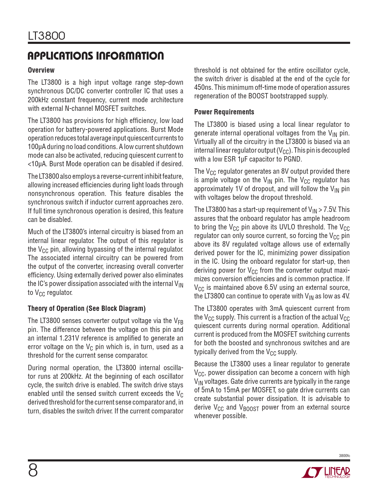 The LT3800 has provisions for high effi ciency, low load The LT3800 is biased using a local linear regulator to operation for battery-powered applications. Burst Mode generate internal operational voltages from the V operation reduces total average input quiescent currents to IN pin. Virtually all of the circuitry in the LT3800 is biased via an 100μA during no load conditions. A low current shutdown internal linear regulator output (V mode can also be activated, reducing quiescent current to CC). This pin is decoupled with a low ESR 1μF capacitor to PGND. <10μA. Burst Mode operation can be disabled if desired. The V The LT3800 also employs a reverse-current inhibit feature, CC regulator generates an 8V output provided there is ample voltage on the V allowing increased effi ciencies during light loads through IN pin. The VCC regulator has approximately 1V of dropout, and will follow the V nonsynchronous operation. This feature disables the IN pin with voltages below the dropout threshold. synchronous switch if inductor current approaches zero. If full time synchronous operation is desired, this feature The LT3800 has a start-up requirement of VIN > 7.5V. This can be disabled. assures that the onboard regulator has ample headroom to bring the V Much of the LT3800’s internal circuitry is biased from an CC pin above its UVLO threshold. The VCC regulator can only source current, so forcing the V internal linear regulator. The output of this regulator is CC pin above its 8V regulated voltage allows use of externally the VCC pin, allowing bypassing of the internal regulator. derived power for the IC, minimizing power dissipation The associated internal circuitry can be powered from in the IC. Using the onboard regulator for start-up, then the output of the converter, increasing overall converter deriving power for V effi ciency. Using externally derived power also eliminates CC from the converter output maxi- mizes conversion effi ciencies and is common practice. If the IC’s power dissipation associated with the internal VIN V to V CC is maintained above 6.5V using an external source, CC regulator. the LT3800 can continue to operate with VIN as low as 4V.