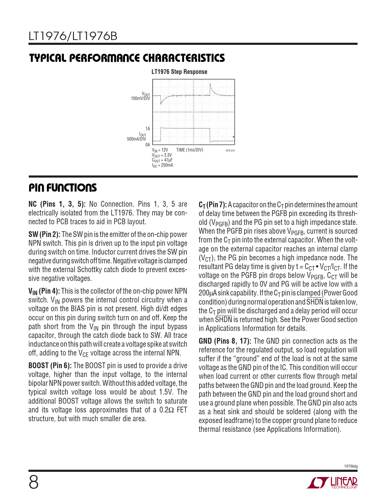 LT1976/LT1976B WUTYPICAL PERFOR A CE CHARACTERISTICSLT1976 Step Response VOUT 100mV/DIV 1A IOUT 500mA/DIV 0A VIN = 12V TIME (1ms/DIV) 1976 G18 VOUT = 3.3V COUT = 47μF IDC = 250mA UUUPI FU CTIO SNC (Pins 1, 3, 5): No Connection. Pins 1, 3, 5 are CT (Pin 7): A capacitor on the CT pin determines the amount electrically isolated from the LT1976. They may be con- of delay time between the PGFB pin exceeding its thresh- nected to PCB traces to aid in PCB layout. old (VPGFB) and the PG pin set to a high impedance state. SW (Pin 2): The SW pin is the emitter of the on-chip power When the PGFB pin rises above VPGFB, current is sourced NPN switch. This pin is driven up to the input pin voltage from the CT pin into the external capacitor. When the volt- during switch on time. Inductor current drives the SW pin age on the external capacitor reaches an internal clamp negative during switch off time. Negative voltage is clamped (VCT), the PG pin becomes a high impedance node. The with the external Schottky catch diode to prevent exces- resultant PG delay time is given by t = CCT • VCT/ICT. If the sive negative voltages. voltage on the PGFB pin drops below VPGFB, CCT will be discharged rapidly to 0V and PG will be active low with a VIN (Pin 4): This is the collector of the on-chip power NPN 200μA sink capability. If the CT pin is clamped (Power Good switch. VIN powers the internal control circuitry when a condition) during normal operation and SHDN is taken low, voltage on the BIAS pin is not present. High di/dt edges the CT pin will be discharged and a delay period will occur occur on this pin during switch turn on and off. Keep the when SHDN is returned high. See the Power Good section path short from the VIN pin through the input bypass in Applications Information for details. capacitor, through the catch diode back to SW. All trace inductance on this path will create a voltage spike at switch GND (Pins 8, 17): The GND pin connection acts as the off, adding to the V reference for the regulated output, so load regulation will CE voltage across the internal NPN. suffer if the “ground” end of the load is not at the same BOOST (Pin 6): The BOOST pin is used to provide a drive voltage as the GND pin of the IC. This condition will occur voltage, higher than the input voltage, to the internal when load current or other currents flow through metal bipolar NPN power switch. Without this added voltage, the paths between the GND pin and the load ground. Keep the typical switch voltage loss would be about 1.5V. The path between the GND pin and the load ground short and additional BOOST voltage allows the switch to saturate use a ground plane when possible. The GND pin also acts and its voltage loss approximates that of a 0.2Ω FET as a heat sink and should be soldered (along with the structure, but with much smaller die area. exposed leadframe) to the copper ground plane to reduce thermal resistance (see Applications Information). 1976bfg 8