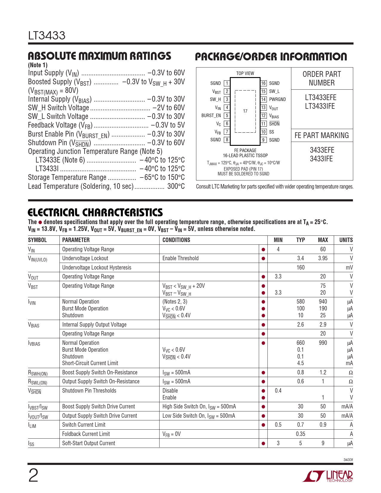 LT3433 WWWUUWUABSOLUTE MAXIMUM RATINGSPACKAGE/ORDER INFORMATION(Note 1) Input Supply (VIN) .. –0.3V to 60V TOP VIEW ORDER PART Boosted Supply (VBST) .. –0.3V to VSW_H + 30V SGND 1 16 SGND NUMBER (VBST(MAX) = 80V) V 2 15 BST SW_L Internal Supply (V SW_H 3 14 PWRGND LT3433EFE BIAS) ... – 0.3V to 30V SW_H Switch Voltage .. – 2V to 60V V 4 13 IN V LT3433IFE OUT 17 SW_L Switch Voltage ... – 0.3V to 30V BURST_EN 5 12 VBIAS Feedback Voltage (V V 6 11 SHDN FB) ... – 0.3V to 5V C Burst Enable Pin (V V 7 10 FB SS BURST_EN) ... – 0.3V to 30V FE PART MARKING Shutdown Pin (V SGND 8 9 SGND SHDN) ... – 0.3V to 60V Operating Junction Temperature Range (Note 5) FE PACKAGE 3433EFE 16-LEAD PLASTIC TSSOP LT3433E (Note 6) .. – 40°C to 125°C 3433IFE TJMAX = 125°C, θJA = 40°C/W, θJC = 10°C/W LT3433I ... – 40°C to 125°C EXPOSED PAD (PIN 17) MUST BE SOLDERED TO SGND Storage Temperature Range .. – 65°C to 150°C Lead Temperature (Soldering, 10 sec)... 300°C Consult LTC Marketing for parts specified with wider operating temperature ranges. ELECTRICAL CHARACTERISTICSThe ● denotes specifications that apply over the full operating temperature range, otherwise specifications are at TA = 25 ° C.VIN = 13.8V, VFB = 1.25V, VOUT = 5V, VBURST_EN = 0V, VBST – VIN = 5V, unless otherwise noted.SYMBOLPARAMETERCONDITIONSMINTYPMAXUNITS VIN Operating Voltage Range ● 4 60 V VIN(UVLO) Undervoltage Lockout Enable Threshold ● 3.4 3.95 V Undervoltage Lockout Hysteresis 160 mV VOUT Operating Voltage Range ● 3.3 20 V VBST Operating Voltage Range VBST < VSW_H + 20V ● 75 V VBST – VSW_H ● 3.3 20 V IVIN Normal Operation (Notes 2, 3) ● 580 940 µA Burst Mode Operation VVC < 0.6V ● 100 190 µA Shutdown VSHDN < 0.4V ● 10 25 µA VBIAS Internal Supply Output Voltage ● 2.6 2.9 V Operating Voltage Range ● 20 V IVBIAS Normal Operation ● 660 990 µA Burst Mode Operation VVC < 0.6V 0.1 µA Shutdown VSHDN < 0.4V 0.1 µA Short-Circuit Current Limit 4.5 mA RSWH(ON) Boost Supply Switch On-Resistance ISW = 500mA ● 0.8 1.2 Ω RSWL(ON) Output Supply Switch On-Resistance ISW = 500mA ● 0.6 1 Ω VSHDN Shutdown Pin Thresholds Disable ● 0.4 V Enable ● 1 V IVBST/ISW Boost Supply Switch Drive Current High Side Switch On, ISW = 500mA ● 30 50 mA/A IVOUT/ISW Output Supply Switch Drive Current Low Side Switch On, ISW = 500mA ● 30 50 mA/A ILIM Switch Current Limit ● 0.5 0.7 0.9 A Foldback Current Limit VFB = 0V 0.35 A ISS Soft-Start Output Current ● 3 5 9 µA 3433f 2