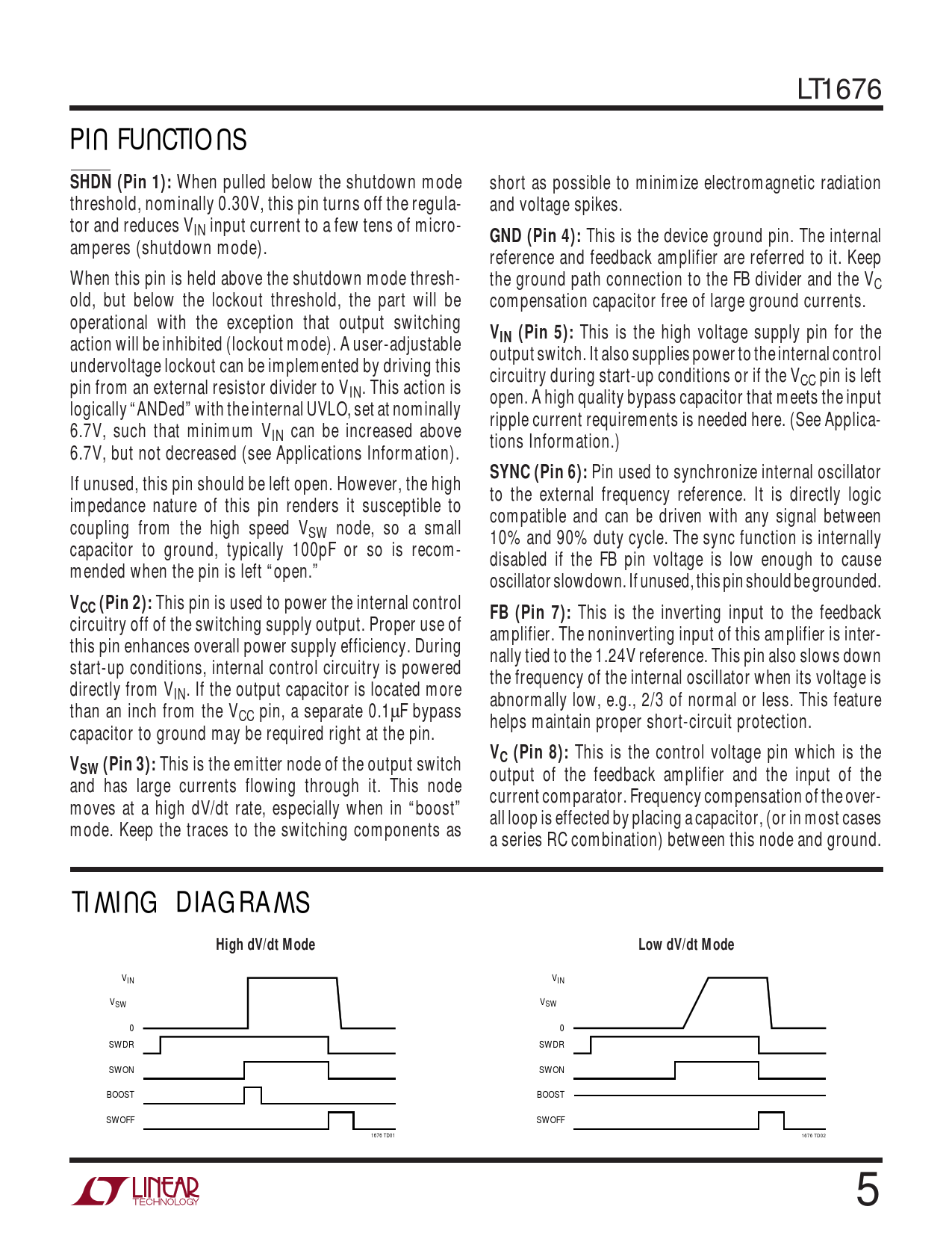 LT1676 UUUPIN FUNCTIONSSHDN (Pin 1): When pulled below the shutdown mode short as possible to minimize electromagnetic radiation threshold, nominally 0.30V, this pin turns off the regula- and voltage spikes. tor and reduces VIN input current to a few tens of micro- GND (Pin 4): This is the device ground pin. The internal amperes (shutdown mode). reference and feedback amplifier are referred to it. Keep When this pin is held above the shutdown mode thresh- the ground path connection to the FB divider and the VC old, but below the lockout threshold, the part will be compensation capacitor free of large ground currents. operational with the exception that output switching V action will be inhibited (lockout mode). A user-adjustable IN (Pin 5): This is the high voltage supply pin for the output switch. It also supplies power to the internal control undervoltage lockout can be implemented by driving this circuitry during start-up conditions or if the V pin from an external resistor divider to V CC pin is left IN. This action is open. A high quality bypass capacitor that meets the input logically “ANDed” with the internal UVLO, set at nominally ripple current requirements is needed here. (See Applica- 6.7V, such that minimum VIN can be increased above tions Information.) 6.7V, but not decreased (see Applications Information). SYNC (Pin 6): Pin used to synchronize internal oscillator If unused, this pin should be left open. However, the high to the external frequency reference. It is directly logic impedance nature of this pin renders it susceptible to compatible and can be driven with any signal between coupling from the high speed VSW node, so a small 10% and 90% duty cycle. The sync function is internally capacitor to ground, typically 100pF or so is recom- disabled if the FB pin voltage is low enough to cause mended when the pin is left “open.” oscillator slowdown. If unused, this pin should be grounded. VCC (Pin 2): This pin is used to power the internal control FB (Pin 7): This is the inverting input to the feedback circuitry off of the switching supply output. Proper use of amplifier. The noninverting input of this amplifier is inter- this pin enhances overall power supply efficiency. During nally tied to the 1.24V reference. This pin also slows down start-up conditions, internal control circuitry is powered the frequency of the internal oscillator when its voltage is directly from VIN. If the output capacitor is located more abnormally low, e.g., 2/3 of normal or less. This feature than an inch from the VCC pin, a separate 0.1µF bypass helps maintain proper short-circuit protection. capacitor to ground may be required right at the pin. VVC (Pin 8): This is the control voltage pin which is the SW (Pin 3): This is the emitter node of the output switch output of the feedback amplifier and the input of the and has large currents flowing through it. This node current comparator. Frequency compensation of the over- moves at a high dV/dt rate, especially when in “boost” all loop is effected by placing a capacitor, (or in most cases mode. Keep the traces to the switching components as a series RC combination) between this node and ground. WUWTIMING DIAGRAMSHigh dV/dt ModeLow dV/dt Mode VIN VIN VSW VSW 0 0 SWDR SWDR SWON SWON BOOST BOOST SWOFF SWOFF 1676 TD01 1676 TD02 5