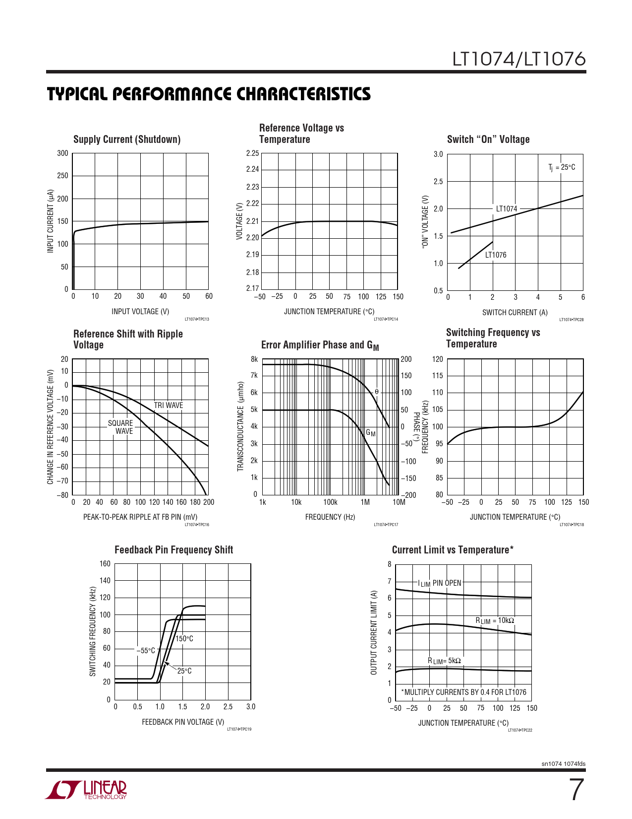 160 8 140 7 I PIN OPEN LIM 120 6 100 5 R = 10k LIM Ω 80 4 150°C 60 –55°C 3 R = 5k LIM Ω 40 2 SWITCHING FREQUENCY (kHz) 25°C OUTPUT CURRENT LIMIT (A) 20 1 *MULTIPLY CURRENTS BY 0.4 FOR LT1076 0 0 0 0.5 1.0 1.5 2.0 2.5 3.0 –50 –25 0 25 50 75 100 125 150 FEEDBACK PIN VOLTAGE (V) JUNCTION TEMPERATURE (°C) LT1074•TPC19 LT1074•TPC22 sn1074 1074fds 7