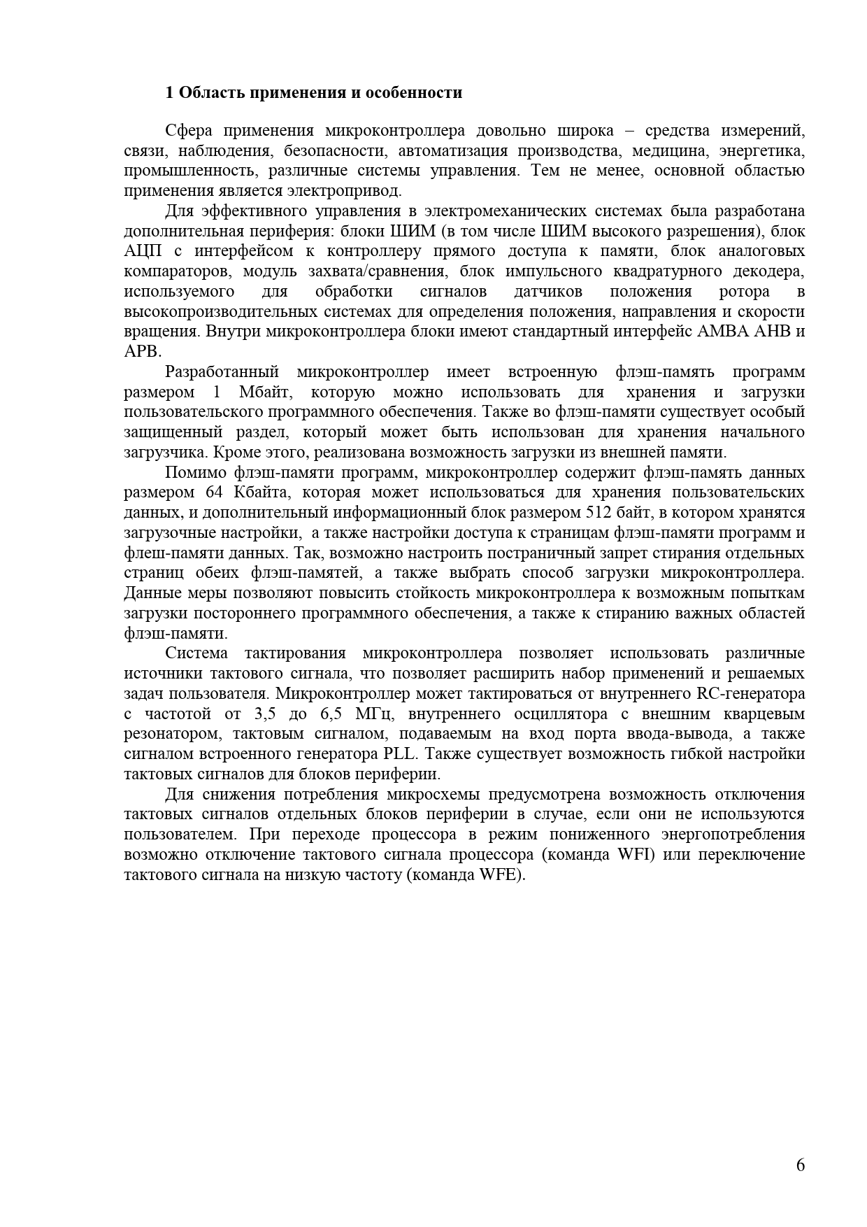 Сфера применения микроконтроллера довольно широка – средства измерений, связи, наблюдения, безопасности, автоматизация производства, медицина, энергетика, промышленность, различные системы управления. Тем не менее, основной областью применения является электропривод. Для эффективного управления в электромеханических системах была разработана дополнительная периферия: блоки ШИМ (в том числе ШИМ высокого разрешения), блок АЦП с интерфейсом к контроллеру прямого доступа к памяти, блок аналоговых компараторов, модуль захвата/сравнения, блок импульсного квадратурного декодера, используемого для обработки сигналов датчиков положения ротора в высокопроизводительных системах для определения положения, направления и скорости вращения. Внутри микроконтроллера блоки имеют стандартный интерфейс AMBA AHB и APB. Разработанный микроконтроллер имеет встроенную флэш-память программ размером 1 Мбайт, которую можно использовать для хранения и загрузки пользовательского программного обеспечения. Также во флэш-памяти существует особый защищенный раздел, который может быть использован для хранения начального загрузчика. Кроме этого, реализована возможность загрузки из внешней памяти. Помимо флэш-памяти программ, микроконтроллер содержит флэш-память данных размером 64 Кбайта, которая может использоваться для хранения пользовательских данных, и дополнительный информационный блок размером 512 байт, в котором хранятся загрузочные настройки, а также настройки доступа к страницам флэш-памяти программ и флеш-памяти данных. Так, возможно настроить постраничный запрет стирания отдельных страниц обеих флэш-памятей, а также выбрать способ загрузки микроконтроллера. Данные меры позволяют повысить стойкость микроконтроллера к возможным попыткам загрузки постороннего программного обеспечения, а также к стиранию важных областей флэш-памяти. Система тактирования микроконтроллера позволяет использовать различные а источники тактового сигнала, что позволяет расширить набор применений и решаемых дат задач пользователя. Микроконтроллер может тактироваться от внутреннего RC-генератора и . с частотой от 3,5 до 6,5 МГц, внутреннего осциллятора с внешним кварцевым дп резонатором, тактовым сигналом, подаваемым на вход порта ввода-вывода, а также По сигналом встроенного генератора PLL. Также существует возможность гибкой настройки тактовых сигналов для блоков периферии. бл Для снижения потребления микросхемы предусмотрена возможность отключения ду тактовых сигналов отдельных блоков периферии в случае, если они не используются № пользователем. При переходе процессора в режим пониженного энергопотребления в. возможно отключение тактового сигнала процессора (команда WFI) или переключение Ин тактового сигнала на низкую частоту (команда WFE). № в. ни .мзаВ а дат и .дп По .длоп № в. Ин 6