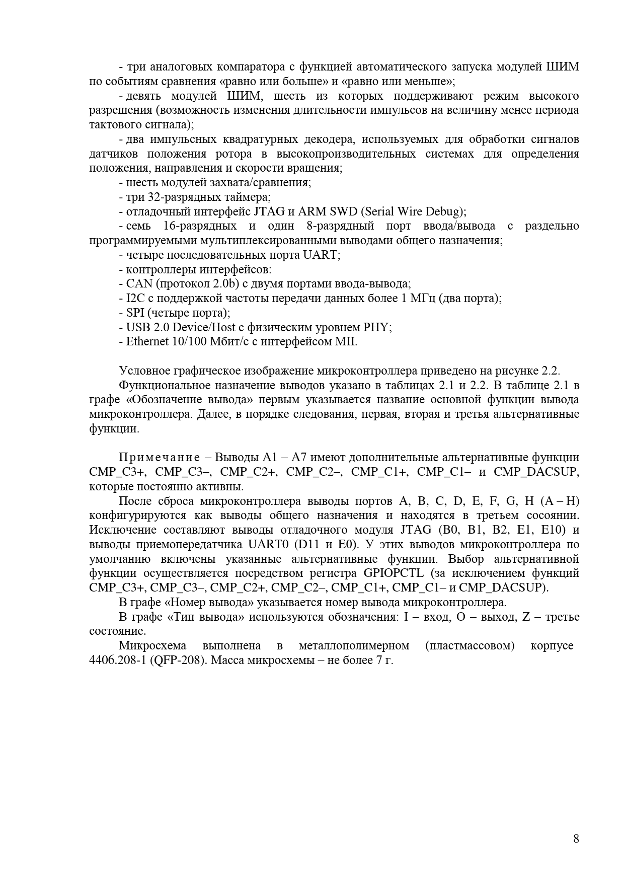 КФДЛ.431295.057ТО - три аналоговых компаратора с функцией автоматического запуска модулей ШИМ по событиям сравнения «равно или больше» и «равно или меньше»; - девять модулей ШИМ, шесть из которых поддерживают режим высокого разрешения (возможность изменения длительности импульсов на величину менее периода тактового сигнала); - два импульсных квадратурных декодера, используемых для обработки сигналов датчиков положения ротора в высокопроизводительных системах для определения положения, направления и скорости вращения; - шесть модулей захвата/сравнения; - три 32-разрядных таймера; - отладочный интерфейс JTAG и ARM SWD (Serial Wire Debug); - семь 16-разрядных и один 8-разрядный порт ввода/вывода с раздельно программируемыми мультиплексированными выводами общего назначения; - четыре последовательных порта UART; - контроллеры интерфейсов: - CAN (протокол 2.0b) с двумя портами ввода-вывода; - I2C с поддержкой частоты передачи данных более 1 МГц (два порта); - SPI (четыре порта); - USB 2.0 Device/Host с физическим уровнем PHY; - Ethernet 10/100 Мбит/с с интерфейсом MII. Условное графическое изображение микроконтроллера приведено на рисунке 2.2. Функциональное назначение выводов указано в таблицах 2.1 и 2.2. В таблице 2.1 в графе «Обозначение вывода» первым указывается название основной функции вывода микроконтроллера. Далее, в порядке следования, первая, вторая и третья альтернативные функции. П р и м е ч а н и е – Выводы A1 – A7 имеют дополнительные альтернативные функции CMP_C3+, CMP_C3–, CMP_C2+, CMP_C2–, CMP_C1+, CMP_C1– и CMP_DACSUP, а которые постоянно активны. дат После сброса микроконтроллера выводы портов A, B, C, D, E, F, G, H (A – H) и . конфигурируются как выводы общего назначения и находятся в третьем сосоянии. дп Исключение составляют выводы отладочного модуля JTAG (B0, B1, B2, E1, E10) и По выводы приемопередатчика UART0 (D11 и E0). У этих выводов микроконтроллера по . умолчанию включены указанные альтернативные функции. Выбор альтернативной бл функции осуществляется посредством регистра GPIOPCTL (за исключением функций ду CMP_C3+, CMP_C3–, CMP_C2+, CMP_C2–, CMP_C1+, CMP_C1– и CMP_DACSUP). № В графе «Номер вывода» указывается номер вывода микроконтроллера. в. В графе «Тип Ин вывода» используются обозначения: I – вход, O – выход, Z – третье состояние. № Микросхема выполнена в металлополимерном (пластмассовом) корпусе в. н 4406.208-1 (QFP-208). Масса микросхемы – не более 7 г. и .м за В а дат и . дп По .длоп № в. Ин 8