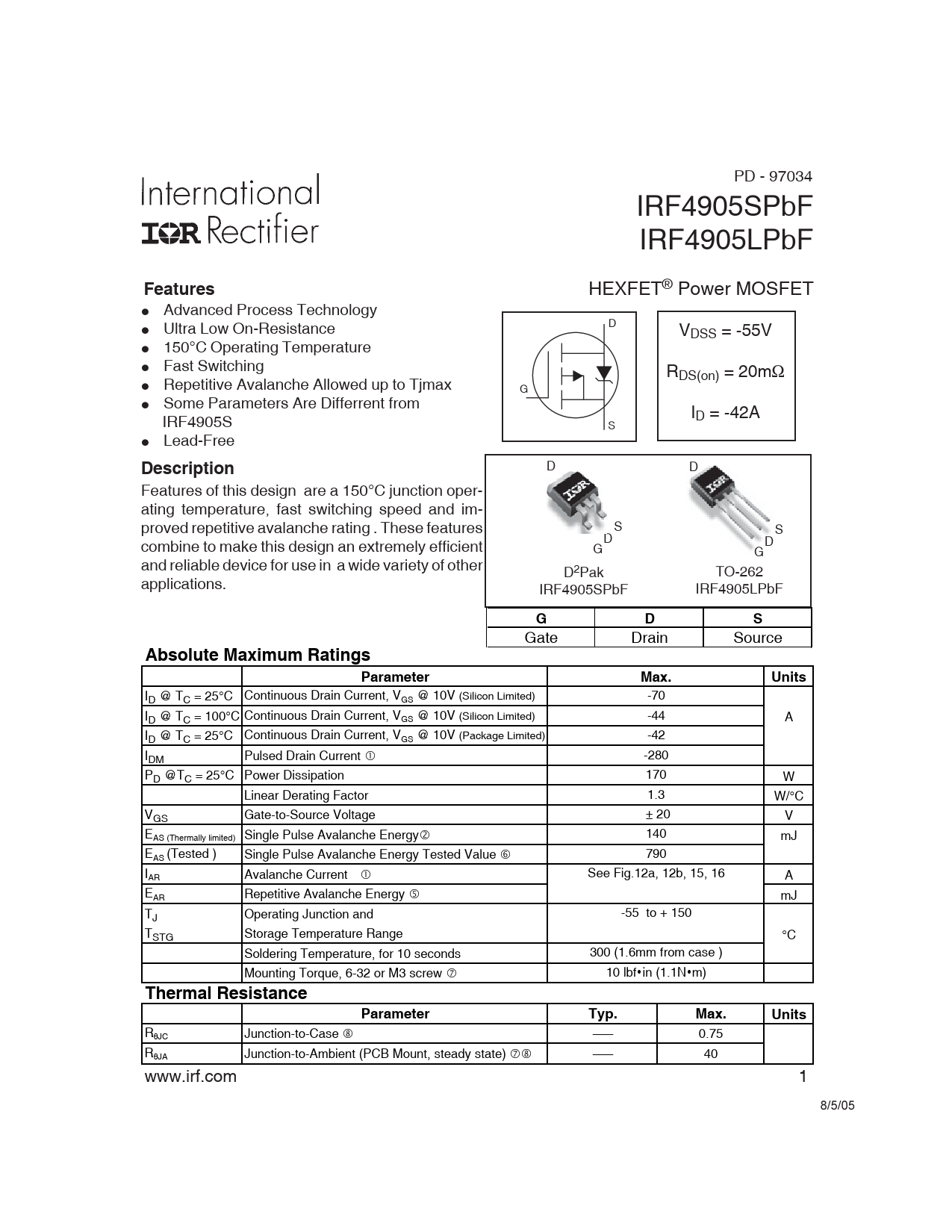 D D Features of this design are a 150°C junction oper- ating temperature, fast switching speed and im- proved repetitive avalanche rating . These features S S combine to make this design an extremely efficient D D G G and reliable device for use in a wide variety of other D2Pak TO-262 applications. IRF4905SPbF IRF4905LPbF