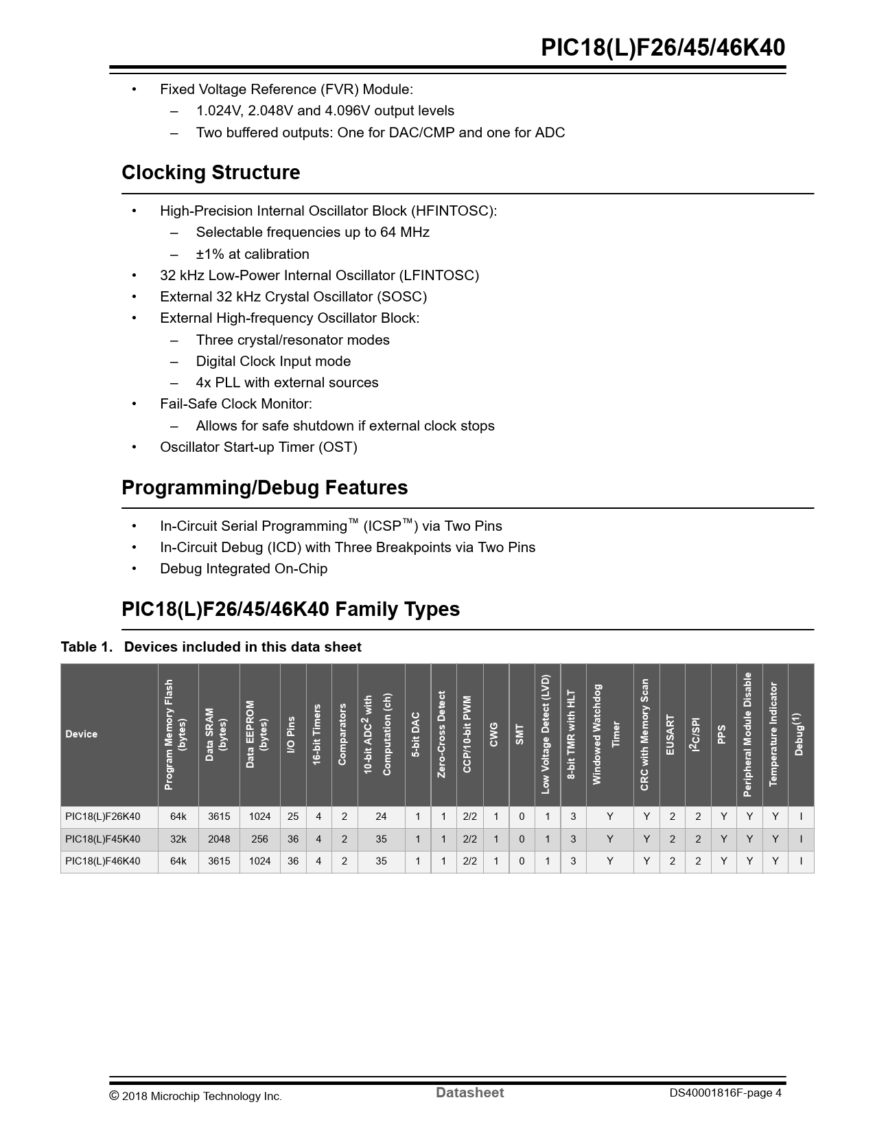 PIC18(L)F26/45/46K40. Clocking Structure. Programming/Debug Features. PIC18(L)F26/45/46K40 Family Types