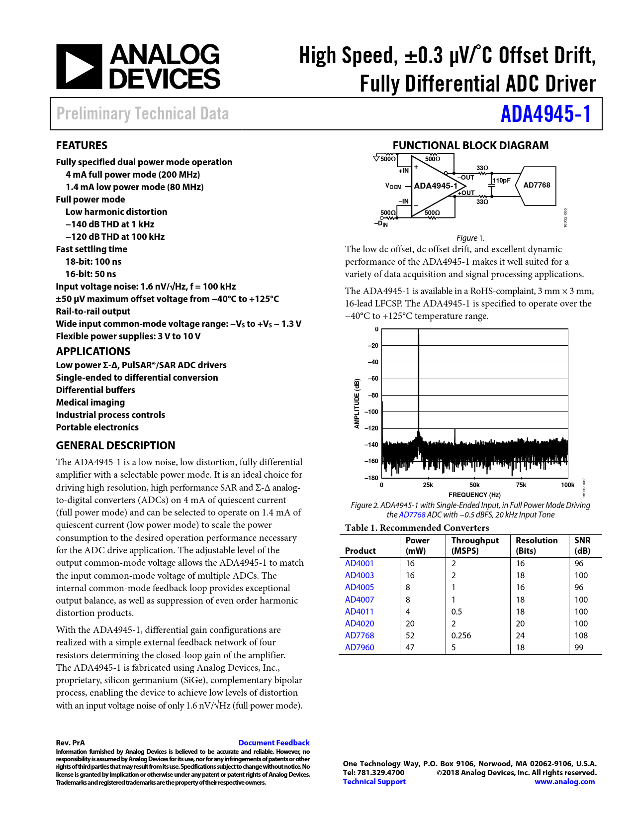 High Speed, ±0.3 µV/˚C Offset Drift,. Ful y Differential ADC Driver. Preliminary Technical Data. ADA4945-1. FEATURES