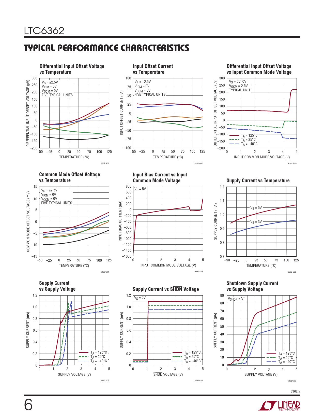 15 800 1.2 V V S = ±2.5V S = 5V V 600 ICM = 0V 10 VOCM = 0V 400 1.1 FIVE TYPICAL UNITS 200 5 0 VS = 5V –200 1.0 0 –400 VS = 3V –600 0.9 –5 –800 INPUT BIAS CURRENT (nA) –1000 SUPPLY CURRENT (mA) 0.8 –10 –1200 COMMON MODE OFFSET VOLTAGE (mV) –1400 –15 –1600 0.7 –50 –25 0 25 50 75 100 125 0 1 2 3 4 5 –50 –25 0 25 50 75 100 125 TEMPERATURE (°C) INPUT COMMON MODE VOLTAGE (V) TEMPERATURE (°C) 6362 G04 6362 G05 6362 G06