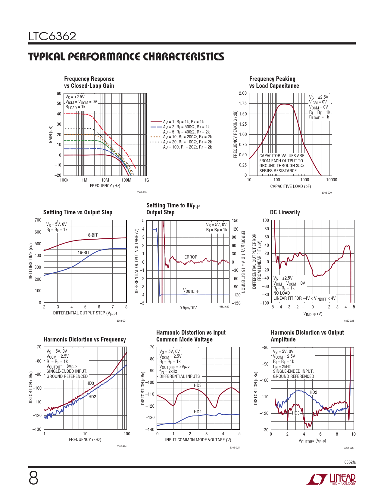 700 5 150 100 VS = 5V, 0V VS = 5V, 0V 4 R 120 ERROR (µV) 1 DIV = 18-BIT ERROR 80 600 RI = RF = 1k I = RF = 1k 18-BIT 3 90 60 500 2 60 40 16-BIT 400 1 30 20 ERROR 0 0 0 300 –1 –30 –20 SETTLING TIME (ns) 200 –2 –60 FROM LINEAR FIT (µV) –40 VS = ±2.5V V –3 –90 ICM = VOCM = 0V DIFFERENTIAL OUTPUT ERROR –60 100 V RI = RF = 1k DIFFERENTIAL OUTPUT VOLTAGE (V) OUTDIFF –4 –120 –80 NO LOAD LINEAR FIT FOR –4V < VINDIFF < 4V 0 –5 –150 –100 2 3 4 5 6 7 8 0.5µs/DIV 6362 G22 –5 –4 –3 –2 –1 0 1 2 3 4 5 DIFFERENTIAL OUTPUT STEP (VP-P) VINDIFF (V) 6362 G21 6362 G23