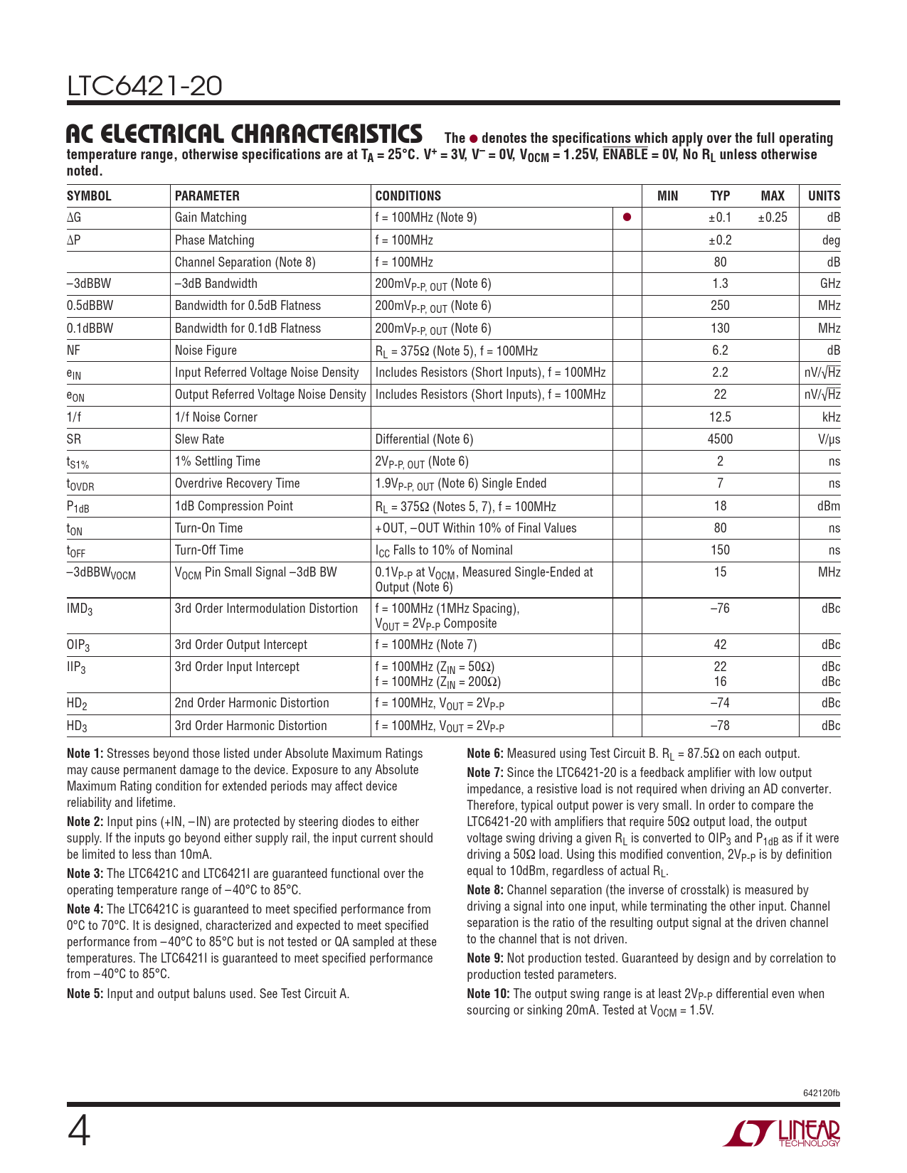 ΔG Gain Matching f = 100MHz (Note 9) l ±0.1 ±0.25 dB ΔP Phase Matching f = 100MHz ±0.2 deg Channel Separation (Note 8) f = 100MHz 80 dB –3dBBW –3dB Bandwidth 200mVP-P, OUT (Note 6) 1.3 GHz 0.5dBBW Bandwidth for 0.5dB Flatness 200mVP-P, OUT (Note 6) 250 MHz 0.1dBBW Bandwidth for 0.1dB Flatness 200mVP-P, OUT (Note 6) 130 MHz NF Noise Figure RL = 375Ω (Note 5), f = 100MHz 6.2 dB eIN Input Referred Voltage Noise Density Includes Resistors (Short Inputs), f = 100MHz 2.2 nV/√Hz eON Output Referred Voltage Noise Density Includes Resistors (Short Inputs), f = 100MHz 22 nV/√Hz 1/f 1/f Noise Corner 12.5 kHz SR Slew Rate Differential (Note 6) 4500 V/μs tS1% 1% Settling Time 2VP-P, OUT (Note 6) 2 ns tOVDR Overdrive Recovery Time 1.9VP-P, OUT (Note 6) Single Ended 7 ns P1dB 1dB Compression Point RL = 375Ω (Notes 5, 7), f = 100MHz 18 dBm tON Turn-On Time +OUT, –OUT Within 10% of Final Values 80 ns tOFF Turn-Off Time ICC Falls to 10% of Nominal 150 ns –3dBBWVOCM VOCM Pin Small Signal –3dB BW 0.1VP-P at VOCM, Measured Single-Ended at 15 MHz Output (Note 6) IMD3 3rd Order Intermodulation Distortion f = 100MHz (1MHz Spacing), –76 dBc VOUT = 2VP-P Composite OIP3 3rd Order Output Intercept f = 100MHz (Note 7) 42 dBc IIP3 3rd Order Input Intercept f = 100MHz (ZIN = 50Ω) 22 dBc f = 100MHz (ZIN = 200Ω) 16 dBc HD2 2nd Order Harmonic Distortion f = 100MHz, VOUT = 2VP-P –74 dBc HD3 3rd Order Harmonic Distortion f = 100MHz, VOUT = 2VP-P –78 dBc